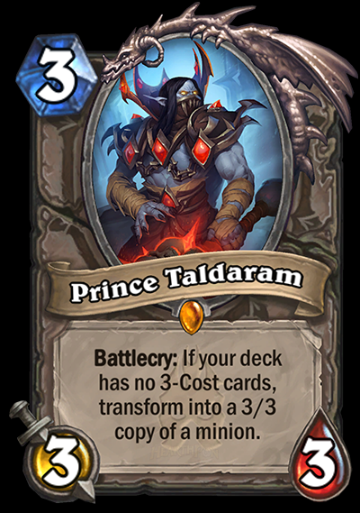 Definitivno najčudnija karta do sada, i postavlja se pravo pitanje – čemu? Ukoliko ne razumete tačno o čemu se radi, u pitanju je čiji je efekat uslovljen time da nemate 3 mana karte u špilu, sličan uslov kao i njegov “brat” Prince Keleseth koga smo videli kada nam je otkrivena ekspanzija. Važno je napomenti da uslov vezan za ostatak špila, dakle možete da stavite i 3 mana karte u špil, bitno je samo da ih sve povučete pre nego što odigrte Taldarama. Ipak, kako se pokazalo sa kartama kao što su Reno i Kazakus, takav rizik često ume da se odbije o glavu i najbolje je u startu praviti štpil sa ispunjenim uslovom.