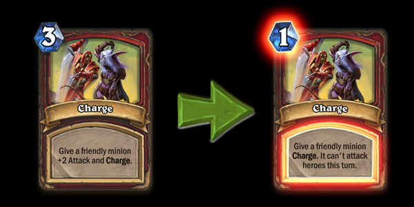 Nakon jučerašnjih nerfova u Hearthstoneu, karta Charge je promenjena tako da sada košta jednu manu i više ne daje +2 attack, ali zato sada sa njom u tom potezu minion na koga je odigrate više ne može da napada protivnika, već samo minione.