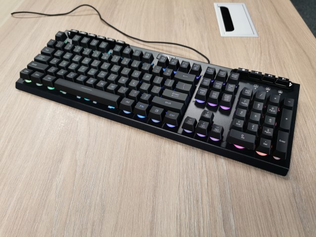 Tastatura ima ukupno 104 tastera u najklasičnijem mogućem rasporedu s tim što se iznad funkcijskih tastera sa leve strane nalaze makro tasteri za posebne komande, dok se sa desne strane iznad numeričkog dela nalaze multimedijalni tasteri za kontrolu reprodukcije muzike. Ovo rešenje je izuzetno dobro jer makro tasteri nisu recimo sa leve strane kao dodatni što nekim korisnicima može biti nezgodno, dok sa druge strane na samoj tastaturi imate dugme da odmah na licu mesta snimite makro komadu (aktiviranje više tastera uzastopno) pa i ne morate uopšte ulaziti u softver da biste to završili. Mala zamerka na multimedijalne tastere ide na činjenicu da nije stavljeno ništa za kontrolu jačine zvuka što nekim korisnicima bude dosta praktično. Tastatura ima mogućnost podešavanja nivoa nagiba, a kabl koji ide do računara na koji se povezuje preko USB porta je končanog tipa pa ćete lako s njim moći da manipulišete na stolu. Dodatna pogodnost jeste što se na kablu nalazi i čičak traka kojom možete lakše manipulisati njime, skratiti ga ili ga povezati sa nekim drugim kablovima na stolu i na taj način napraviti čistiji izgled celog okruženja.