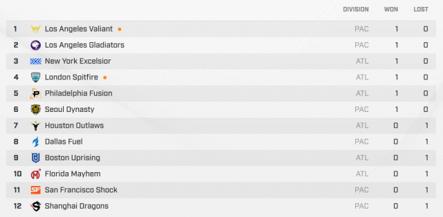 Sa ovim mečevima imamo i konačne rezultate prvog kola lige, a stanje na tabeli možete videti ispod. Kao što vidimo, poredak na tabeli kod jednakih bodova će diktirati saldo pobeđenih i izgubljenih mapa. Liga se nastavlja već večeras, a na programu su sledeći mečevi: Los Angeles Valiant – Dallas Fuel; Florida Mayhem – Boston Uprising; San Francisco Shock – Shaghai Dragons.