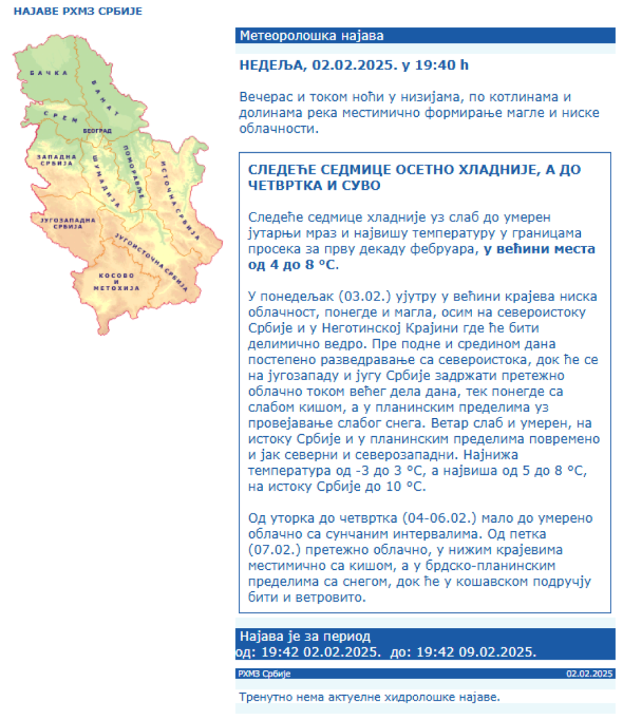 Sledeće sedmice hladnije uz slab do umeren jutarnji mraz i najvišu temperaturu u granicama proseka za prvu dekadu februara, u većini mesta od 4 do 8 °C.