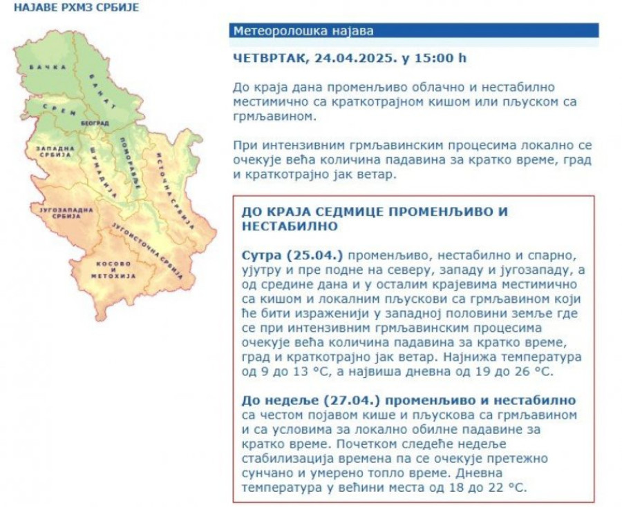 "Do nedelje (27.04.) promenljivo i nestabilno sa čestom pojavom kiše i pljuskova sa grmljavinom i sa uslovima za lokalno obilne padavine za kratko vreme. Početkom sledeće nedelje stabilizacija vremena pa se očekuje pretežno sunčano i umereno toplo vreme. Dnevna temperatura u većini mesta od 18 do 22 °S", stoji na sajtu RHMZ.