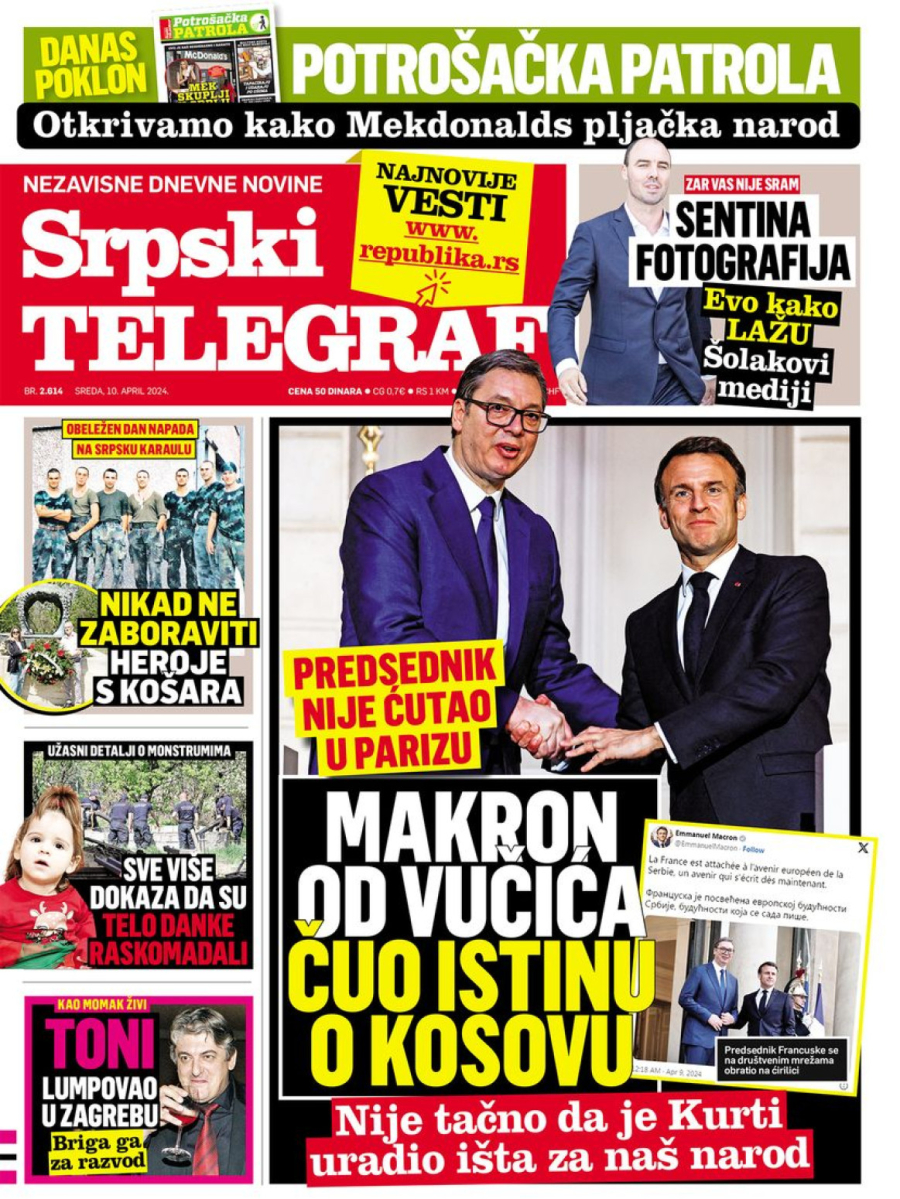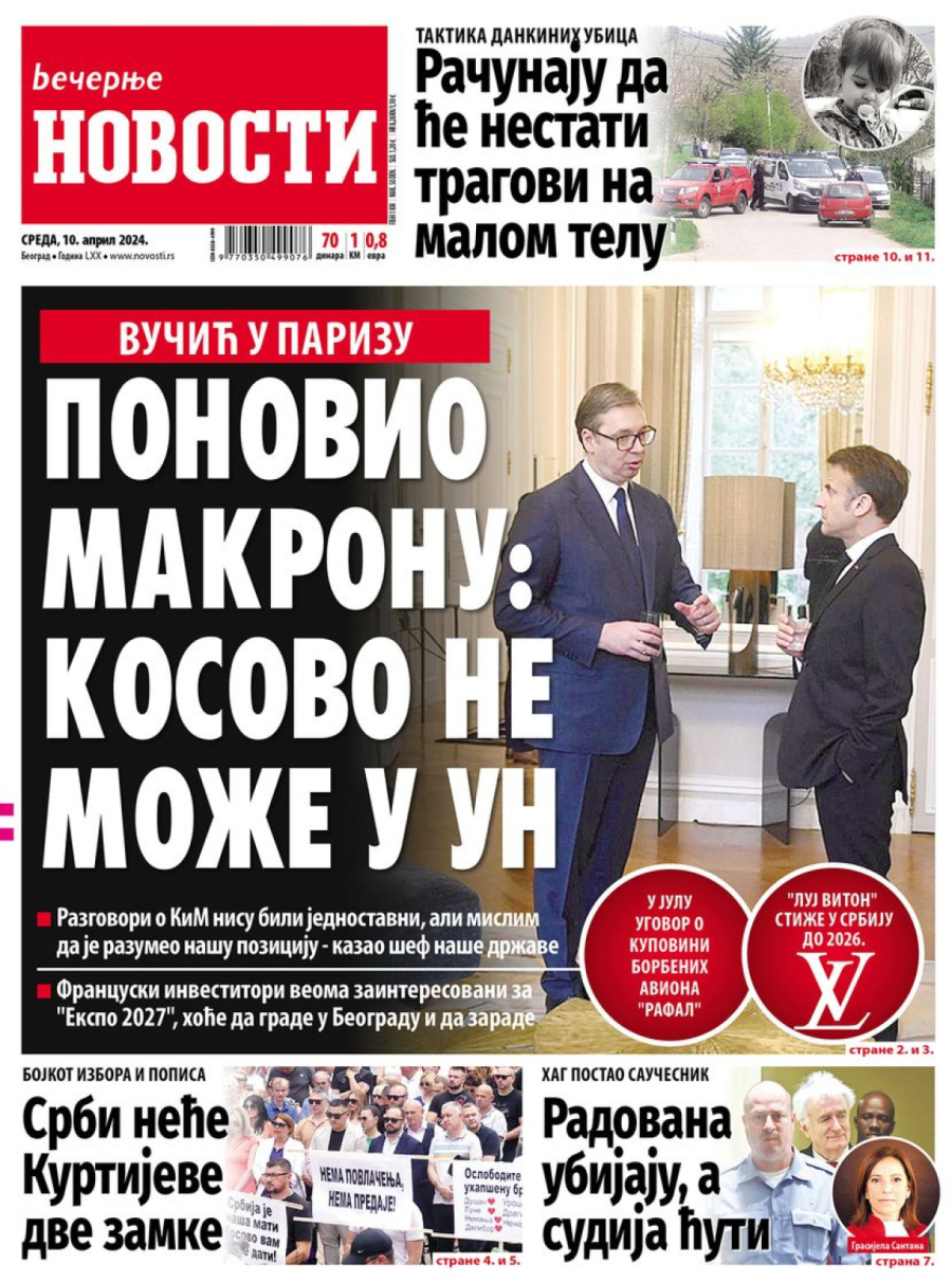 Novine: "Dogovor o rafalima, Makron stiže u Srbiju";"Ponovio Makronu: Kosovo ne može u UN"