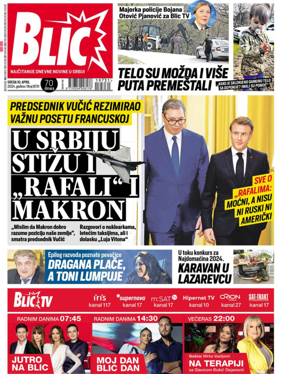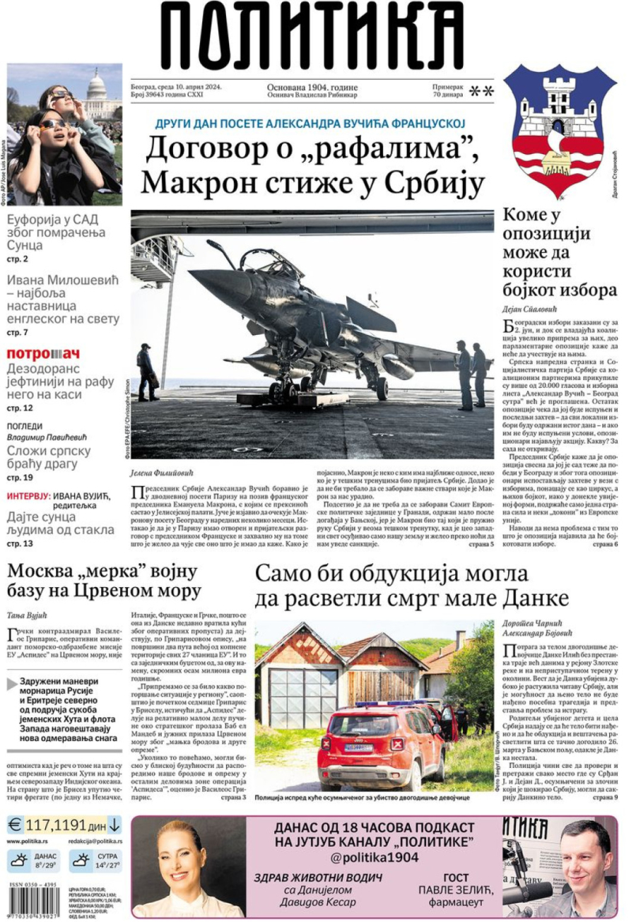 Dnevne novine u Srbiji za sredu, 10. april 2024. godine, na naslovnim stranama najavljuju brojne aktuelne društveno-političke teme i donose ekskluzivne priče.