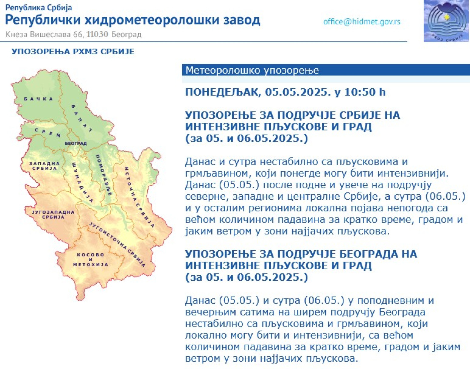 Republički hidrometeorološki zavod (RHMZ) izdao је upozorenje na nepovoljne vremenske prilike koje se očekuju od 5. do 9. maja 2025. godine. Kako su najavili, očekuju se pljuskovi i grmljavina, a kiša u Beogradu već je počela da pada.