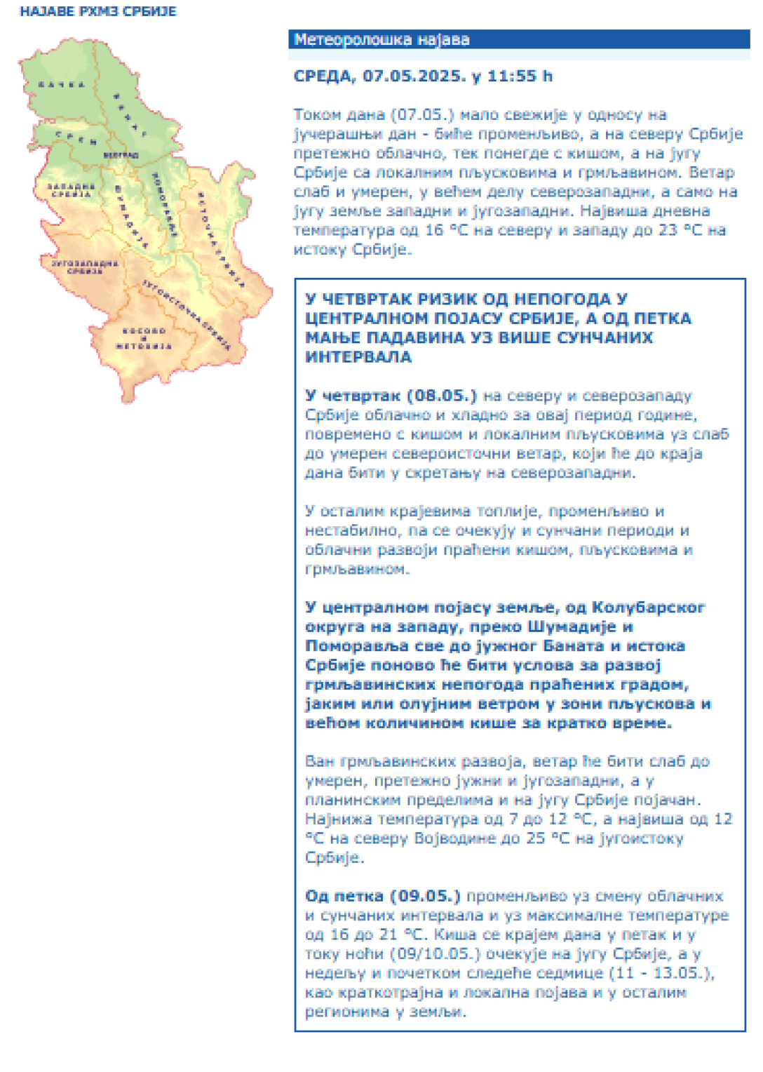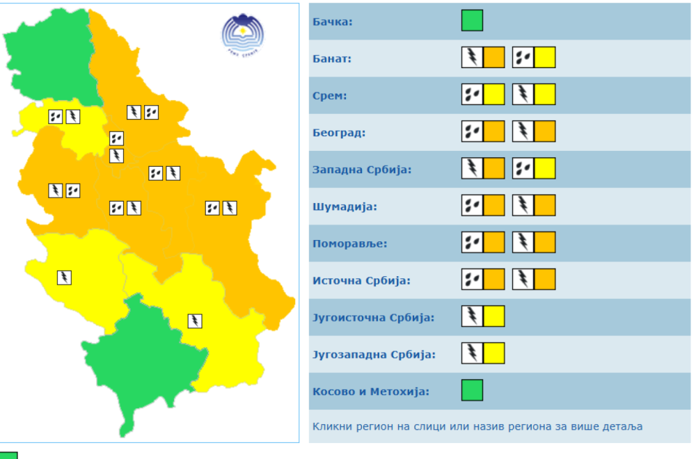 "Sutra se rizik od nepogoda ponovo značajno povećava u centralnom pojasu Srbije – od Kolubarskog okruga na zapadu, preko Šumadije i Pomoravlјa, sve do juga Banata i istočne Srbije. Osim grada i olujnog vetra, u oblasti jakih plјuskova očekuje se i velika količina kiše za relativno kratko vreme (20–40 mm, lokalno i više)".