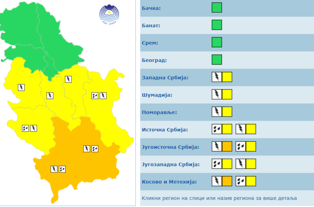 U centralnom pojasu zemlje, od Kolubarskog okruga na zapadu, preko Šumadije i Pomoravlja sve do južnog Banata i istoka Srbije, ponovo će biti uslova za razvoj grmljavinskih nepogoda praćenih gradom, jakim ili olujnim vetrom u zoni pljuskova i većom količinom kiše za kratko vreme.