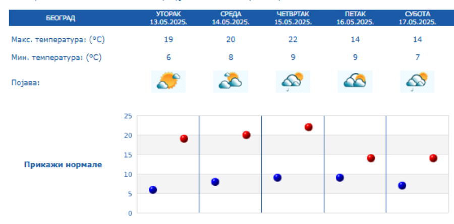 "U sredu (14. maj) promenljivo uz smenu sunčanih i oblačnih intervala i u većini mesta suvo. U jutarnjim satima do četvrtka (15. maj) lokalno se očekuje i pojava slabog prizemnog mraza. U četvrtak (15. maj) posle podne i uveče na severu i zapadu Srbije naoblačenje s kišom i lokalnim pljuskovima sa grmljavinom. Padavinska zona će se u petak (16. maj) izmestiti na jug i istok Srbije. Na visokim planinama moguć je i sneg. Za vikend, ali i početkom naredne sedmice (17. - 20. maj) nastavak promenljivog i relativno svežeg perioda uz povremeno pojačan severozapadni vetar, a pojava kiše ili lokalnog pljuska biće izolovana i kratkotrajna", navodi RHMZ.