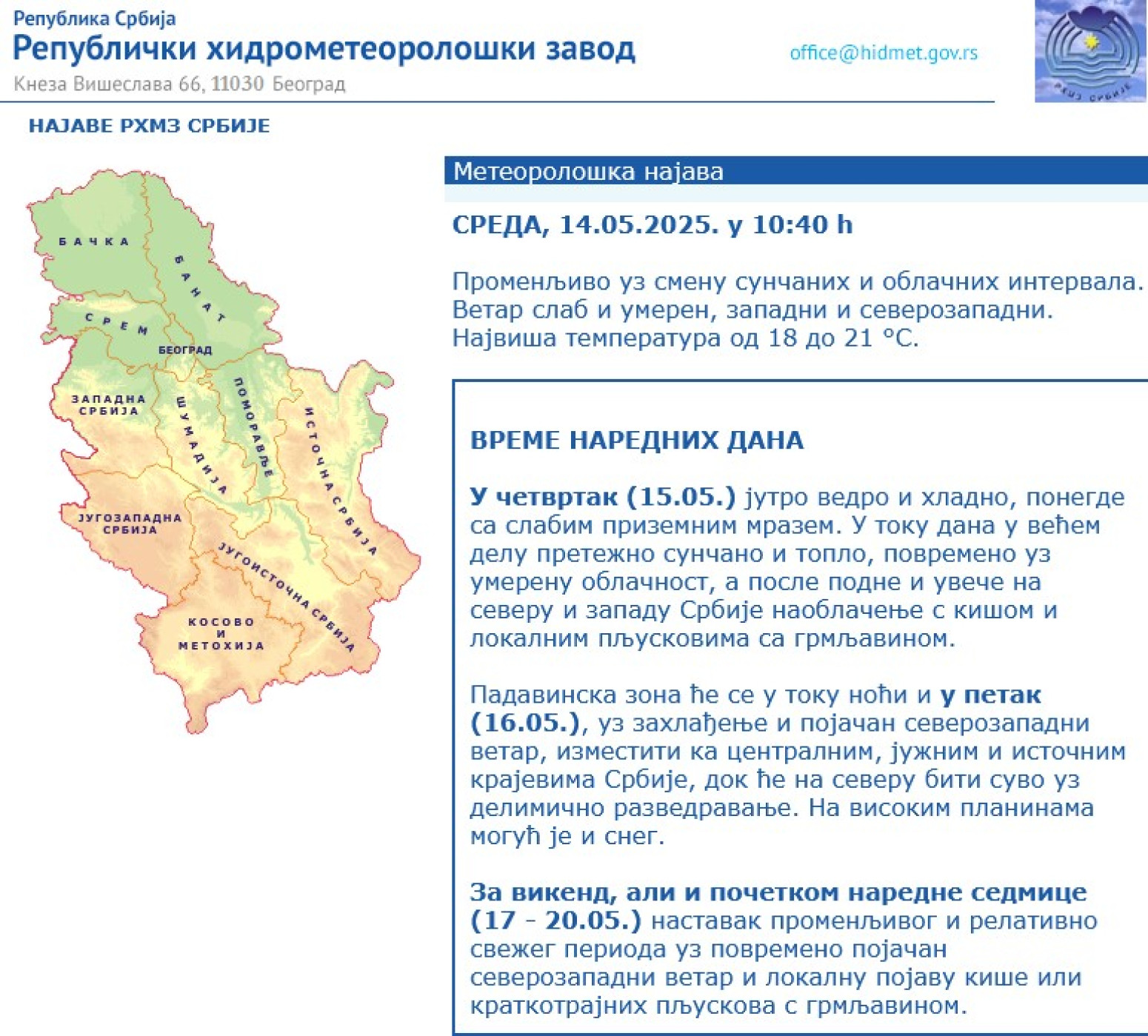 Maj 2025. u Srbiji protiče uz neobično niske temperature i najavu snega u planinskim predelima, a meteorolozi ističu da su ovakve vremenske prilike i dalje u granicama proseka.
