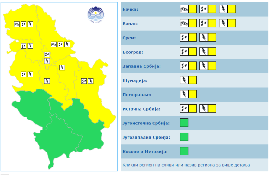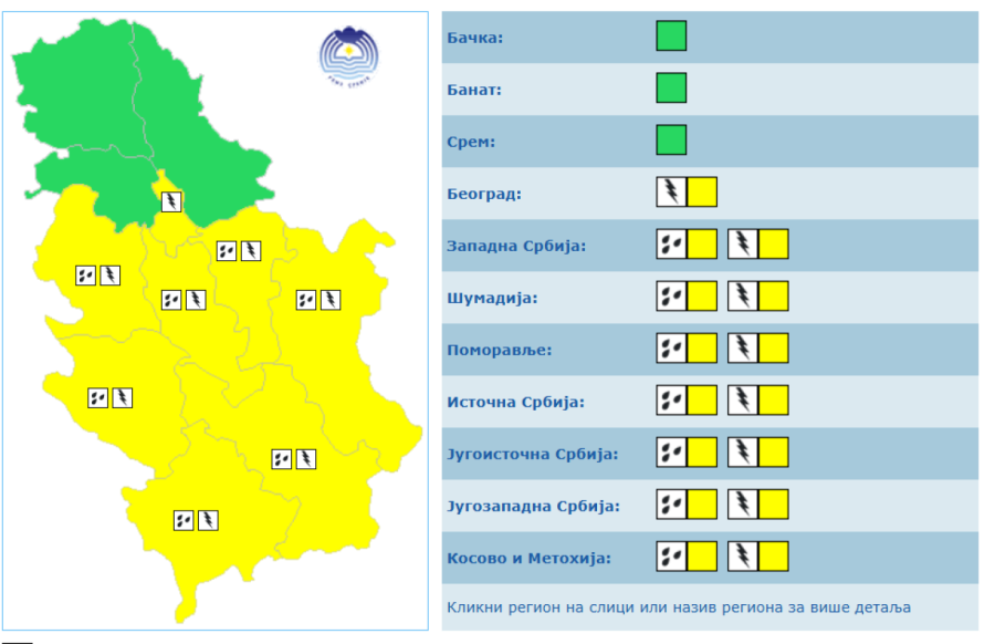 Prema najavi RHMZ, danas je na teritoriji Banata, Šumadije, Srema, Beograda, Šumadije, na zapadu i jugozapadu Srbije na snazi žuti meteoalarm za lokalnu pojavu grmljavina sa ili bez padavina.