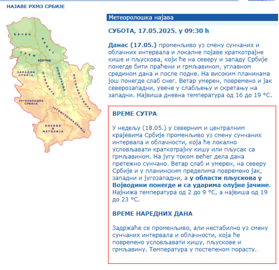 "Danas će biti promenljivo uz smenu sunčanih i oblačnih intervala i lokalne pojave kratkotrajne kiše i pljuskova, koji će na severu i zapadu Srbije ponegde biti praćeni i grmljavinom, uglavnom sredinom dana i posle podne", objavljeno je u prognozi Republičkog hidrometeorološkog zavoda Srbije (RHMZ).