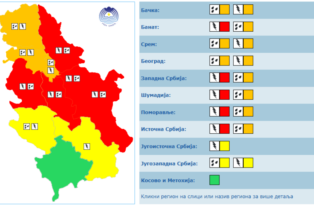 Za veći deo Srbije na snazi je crveni meteorološki alarm, što znači da je vreme vrlo opasno. Prognozirane su naročito opasne vremenske pojave, a takvog su intenziteta da mogu prouzrokovati veliku materijalnu štetu i biti veoma opasne po bezbednost ljudi i životinja. Treba se često informisati o detaljima očekivanih meteoroloških uslova i rizika. Slediti naredbe i savete nadležnih državnih službi.