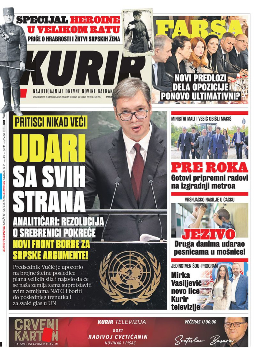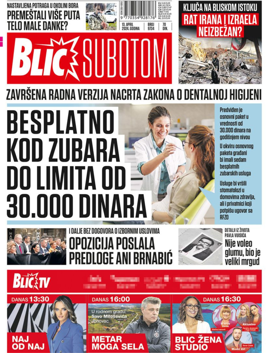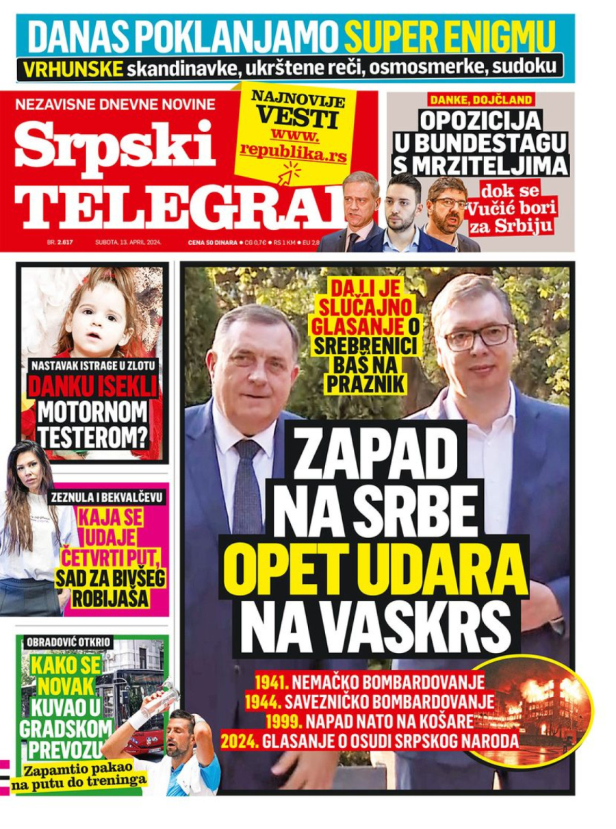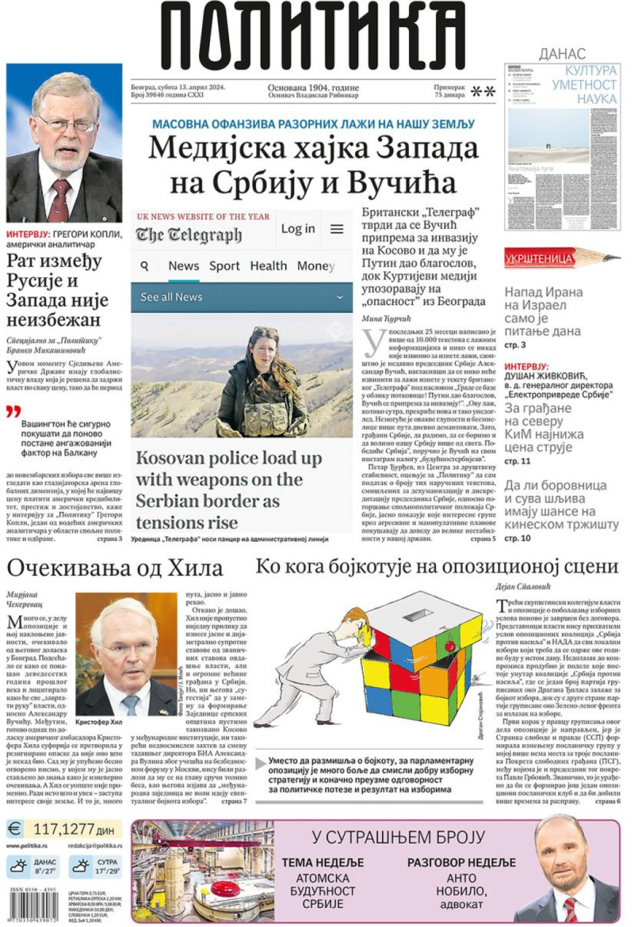 Dnevne novine u Srbiji za subotu, 13. april 2024. godine, na naslovnim stranama donose brojne aktuelne društveno-političke teme i ekskluzivne priče.