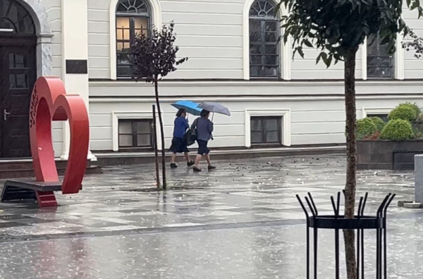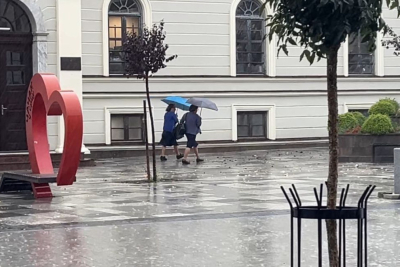 U kratkom vremenskom periodu pala je velika količina kiše, pa se voda prelivala iz oluka na zgradama u centru grada.