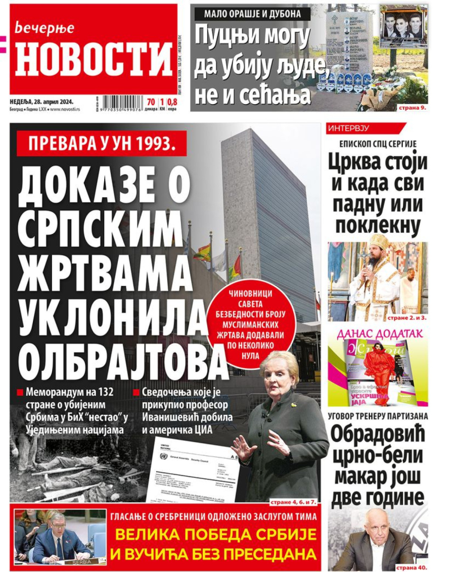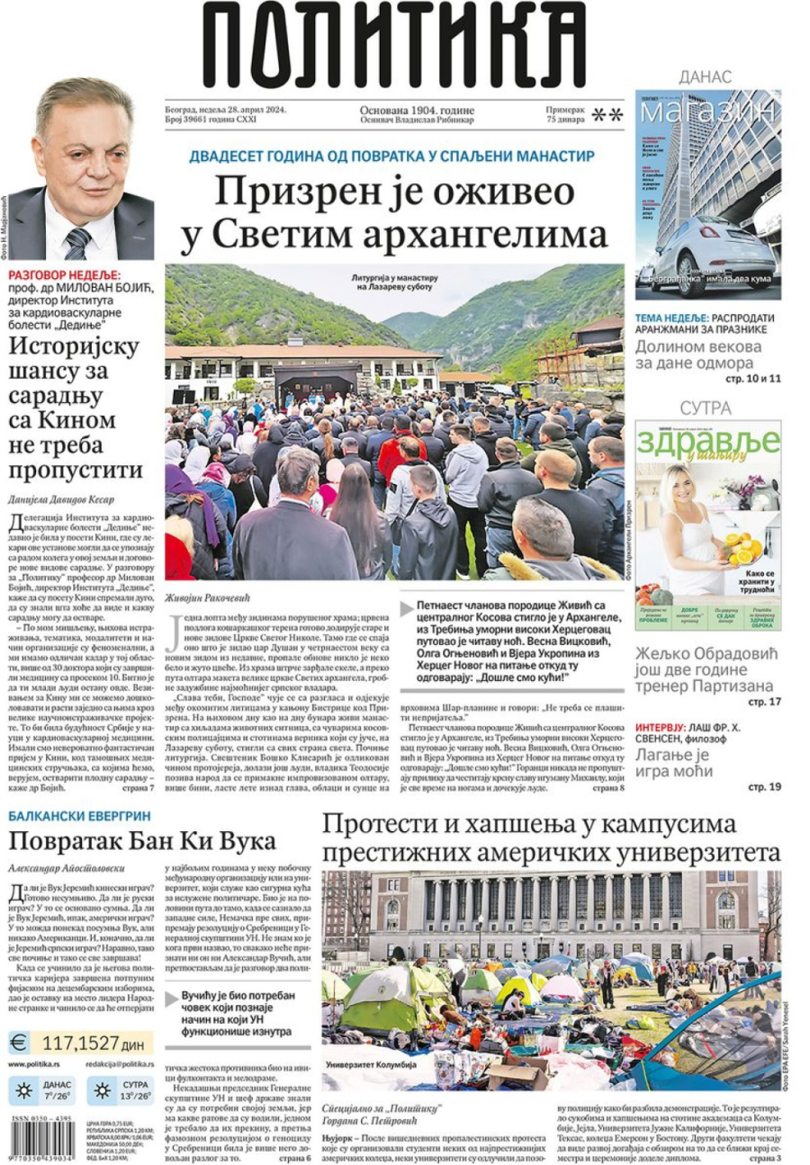 Novine: "Prizren je oživeo u Svetim arhangelima"; "Dokaze o srpskim žrtvama uklonila Olbrajtova"