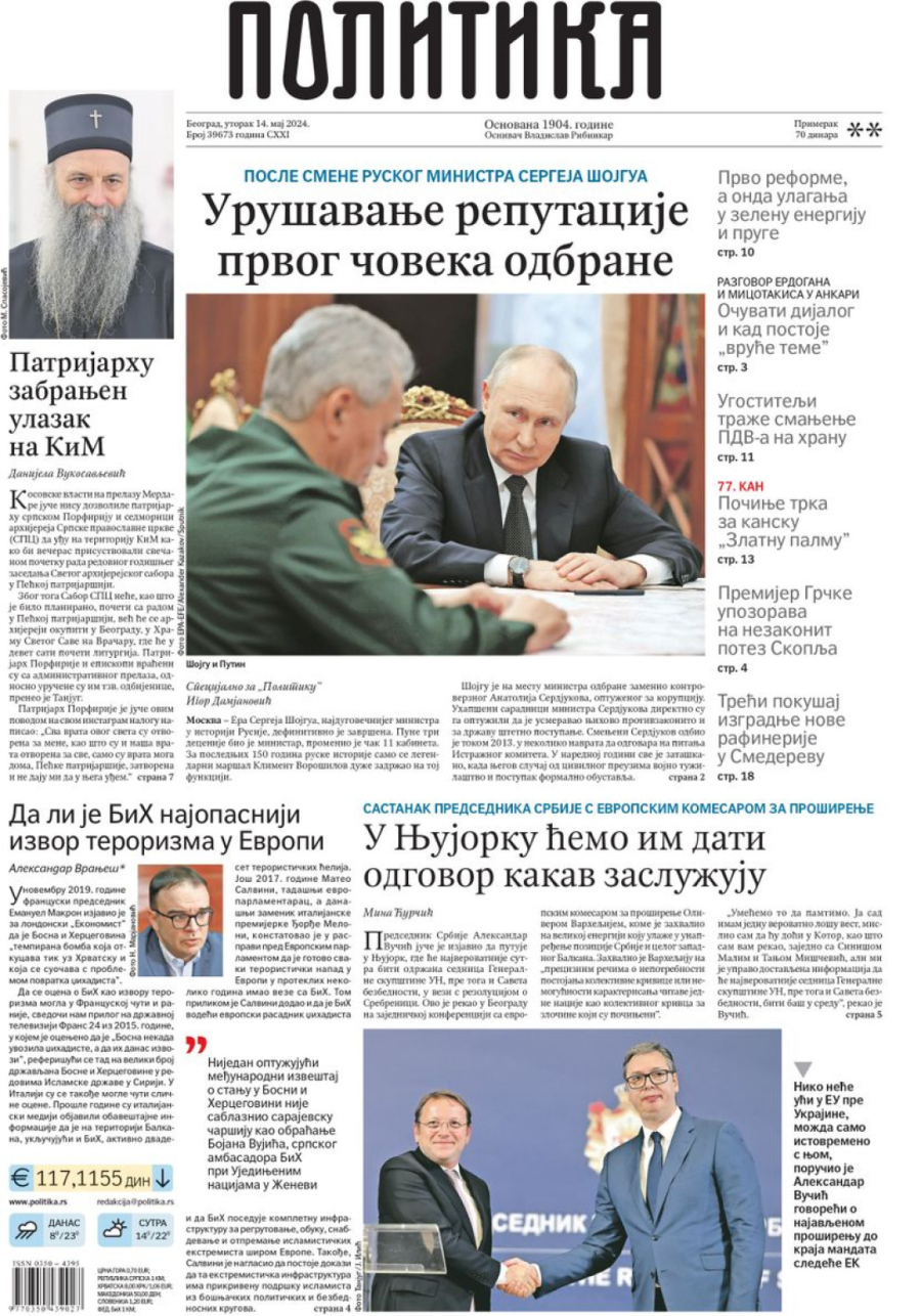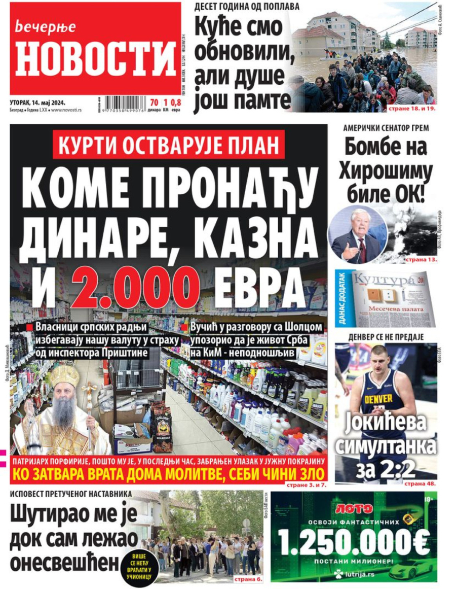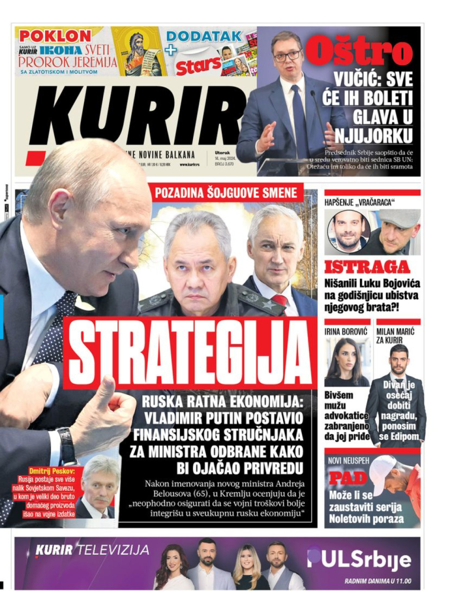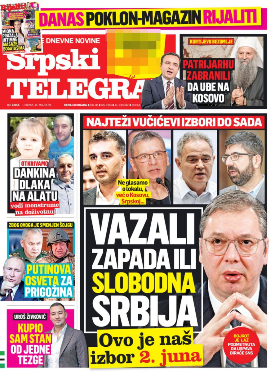 Dnevne novine u Srbiji za utorak, 14. maj 2024. godine, na naslovnim stranama najavljuju brojne aktuelne društveno-političke teme i donose ekskluzivne priče.