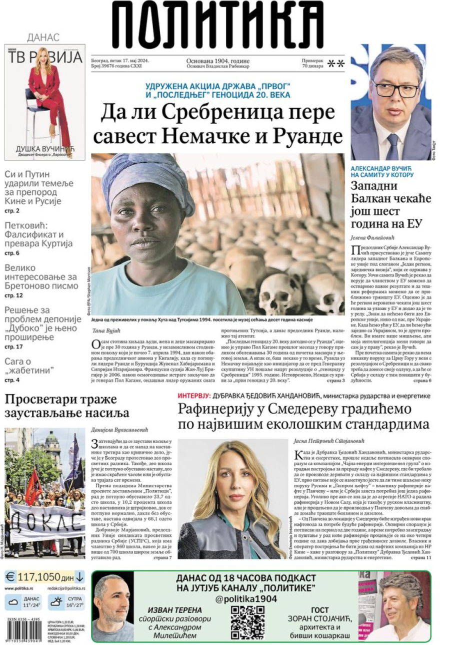 Novine: "Da li Srebrenica pere savest Nemačke i Ruande?"; "Kome to smetaju slobodni vladari?"