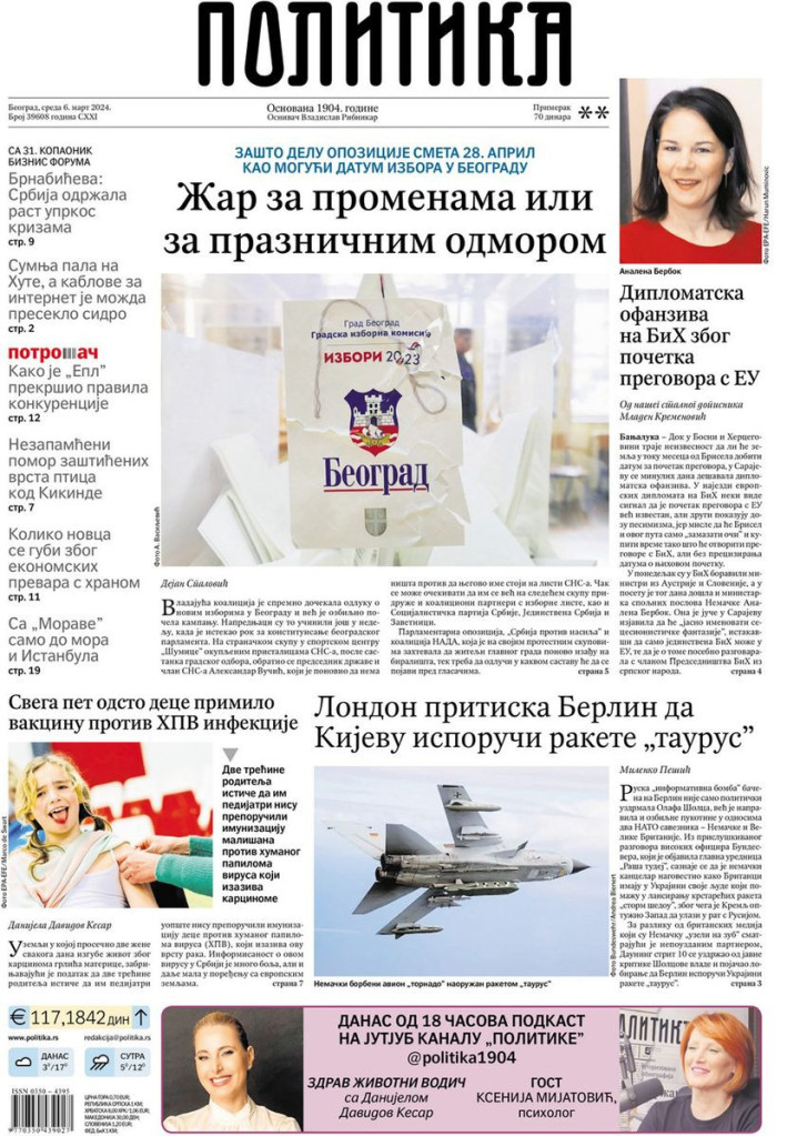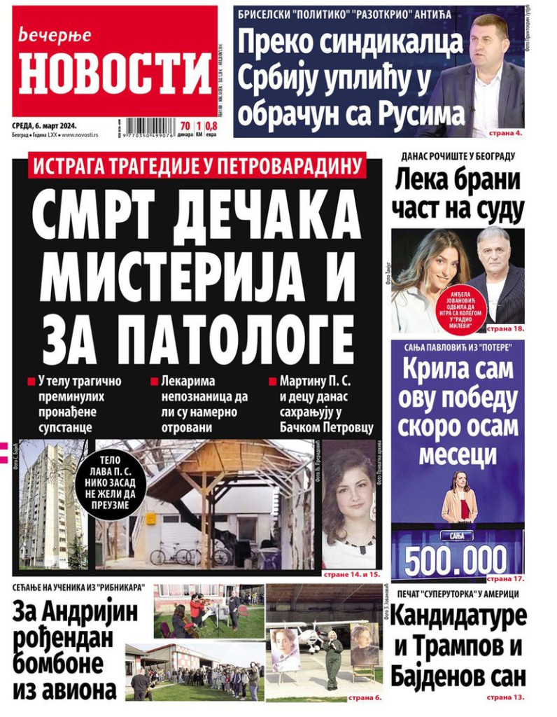 Dnevne novine u Srbiji za sredu, 6. mart 2024. godine na naslovnim stranama donose brojne aktuelne društveno-političke teme.