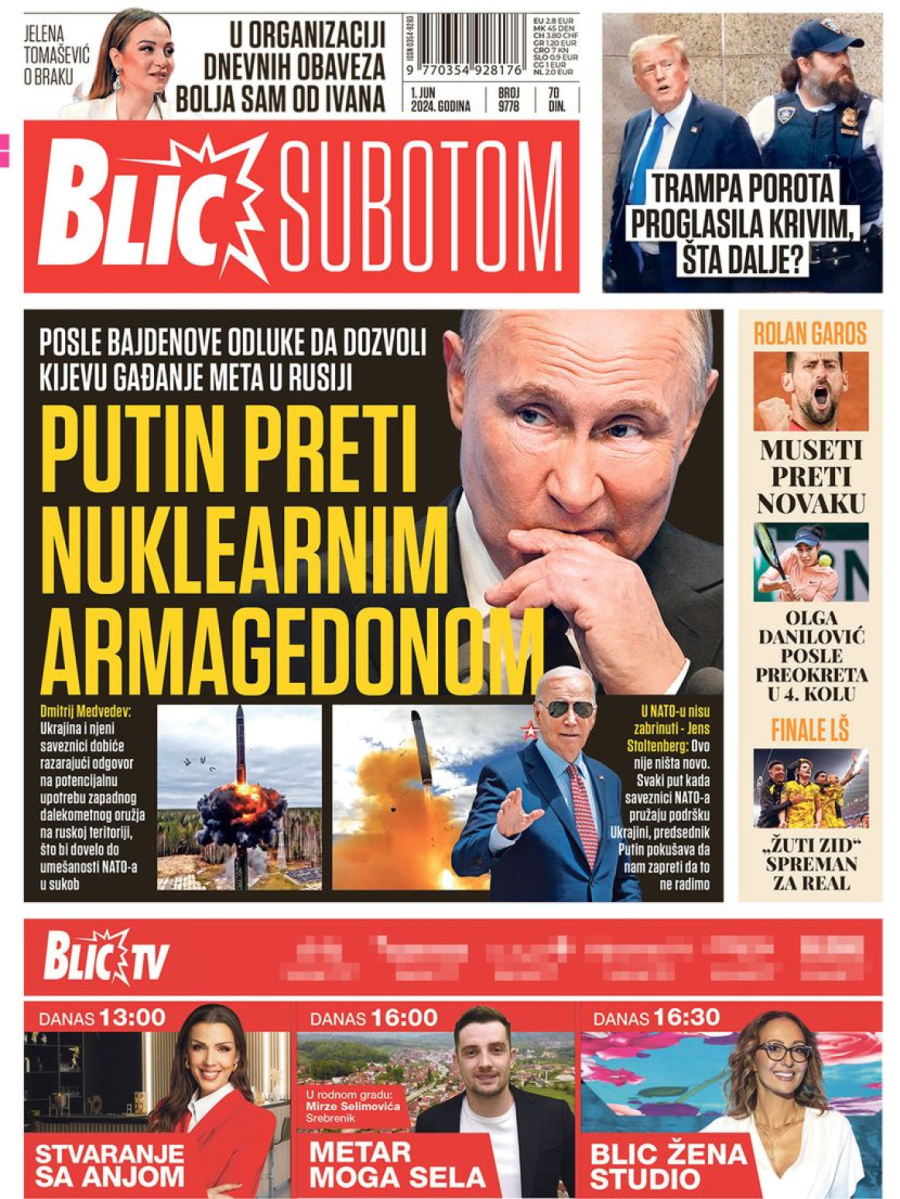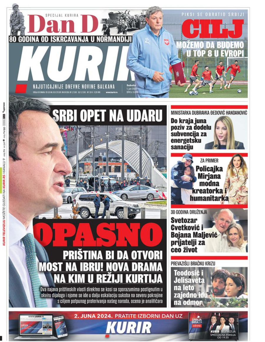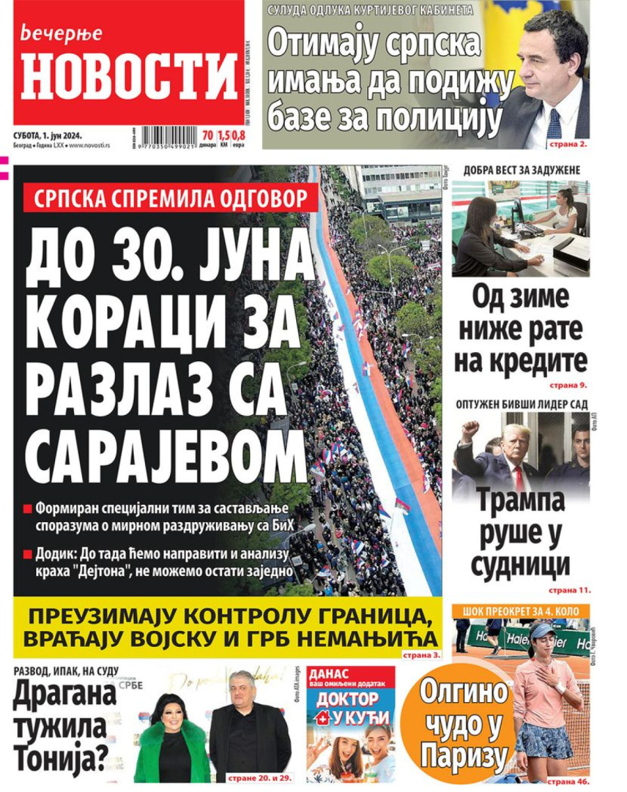 Dnevne novine u Srbiji za subotu, 1. jun 2024.. godine, na naslovnim stranama najavljuju brojne aktuelne društveno-političke teme i donose ekskluzivne priče.