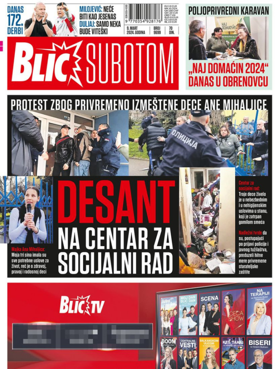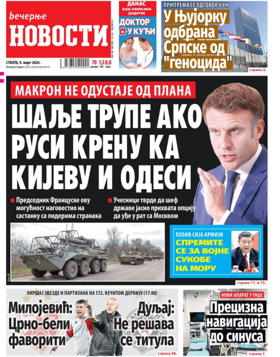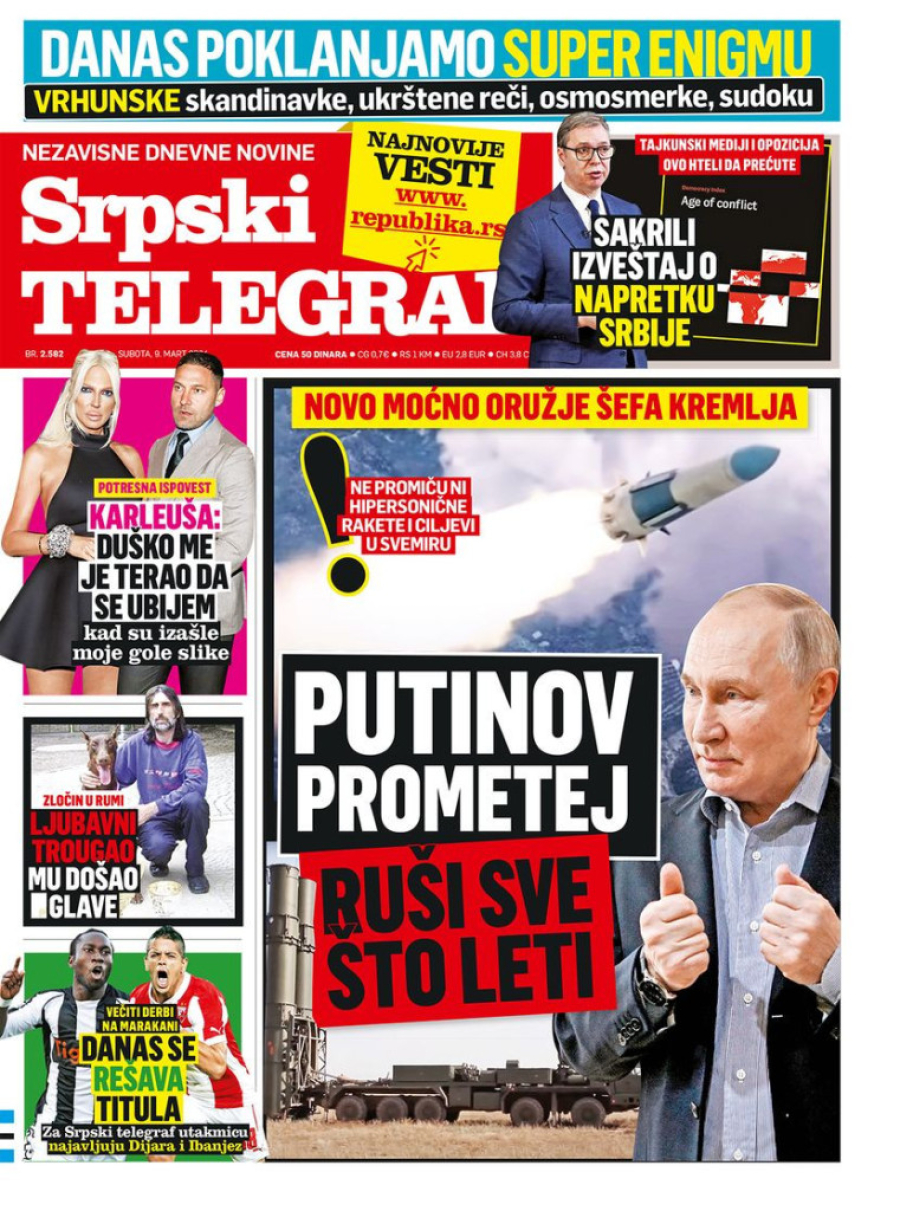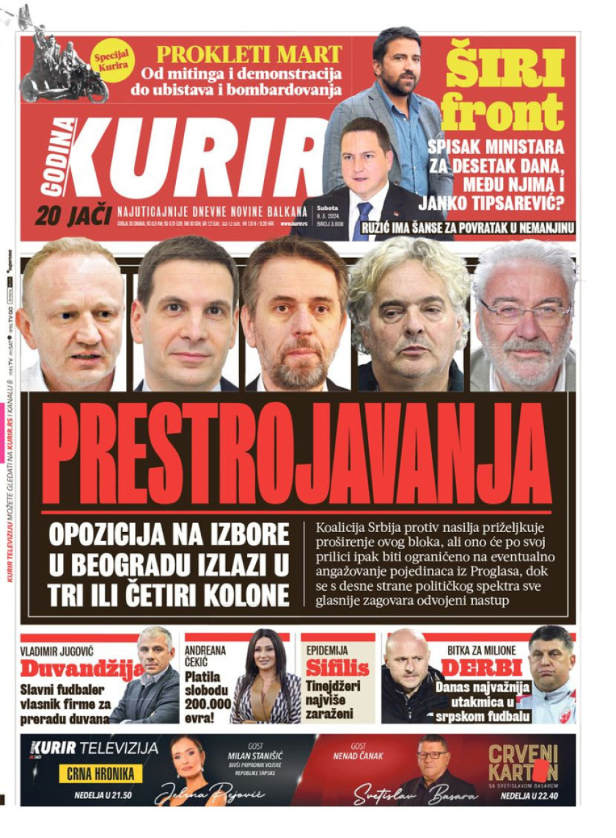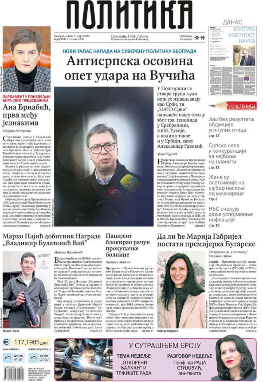 Dnevne novine u Srbiji za subotu, 9. mart 2024. godine na naslovnim stranama donose brojne aktuelne društveno-političke teme.