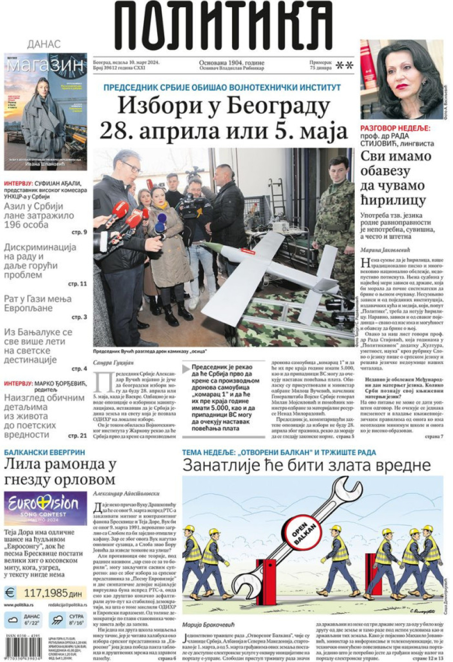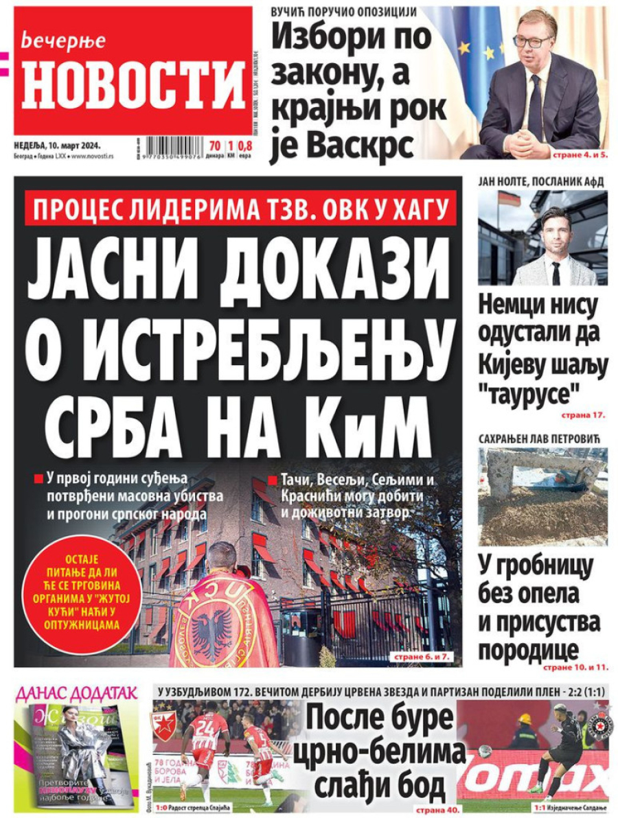 Dnevne novine u Srbiji za nedelju, 10. mart 2024. godine na naslovnim stranama donose brojne aktuelne društveno-političke teme.
