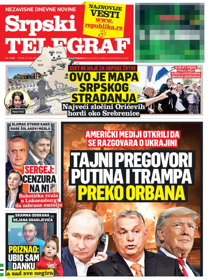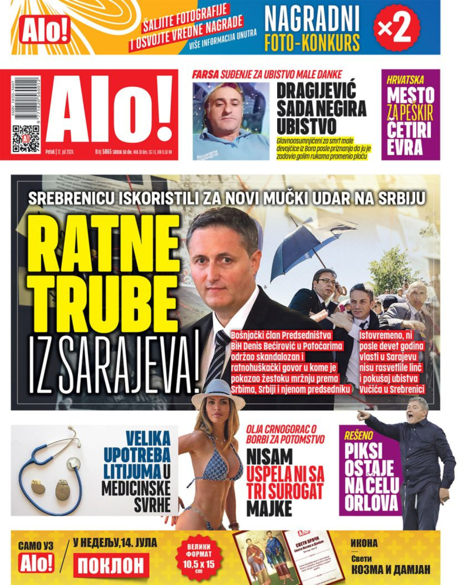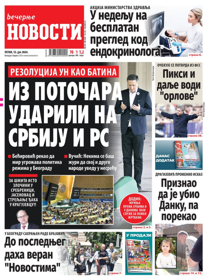 Novine: "Obeležena 29. godišnjica zločina u Srebrenici"; "Iz Potočara udarili na Srbiju i RS"