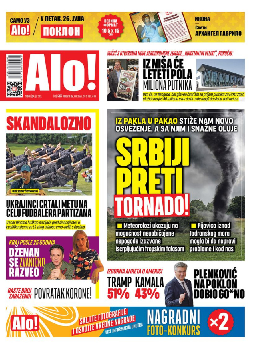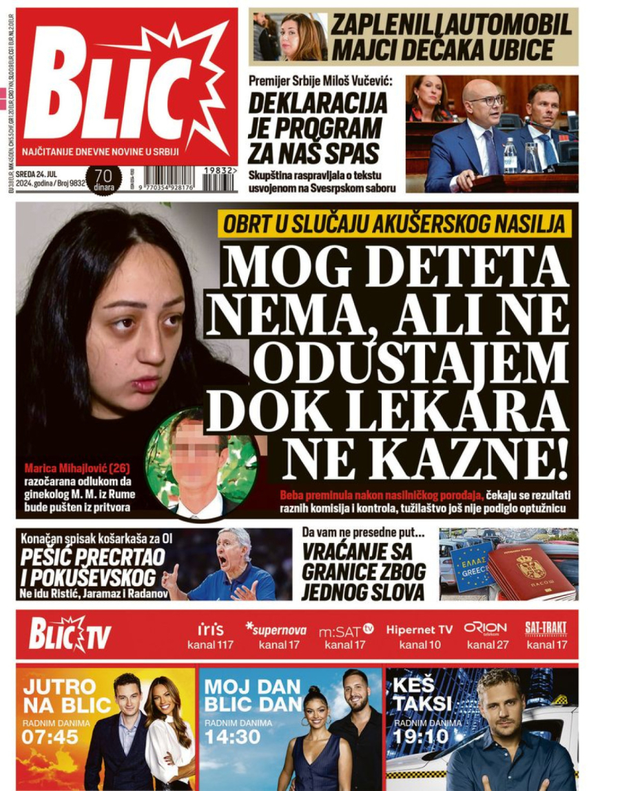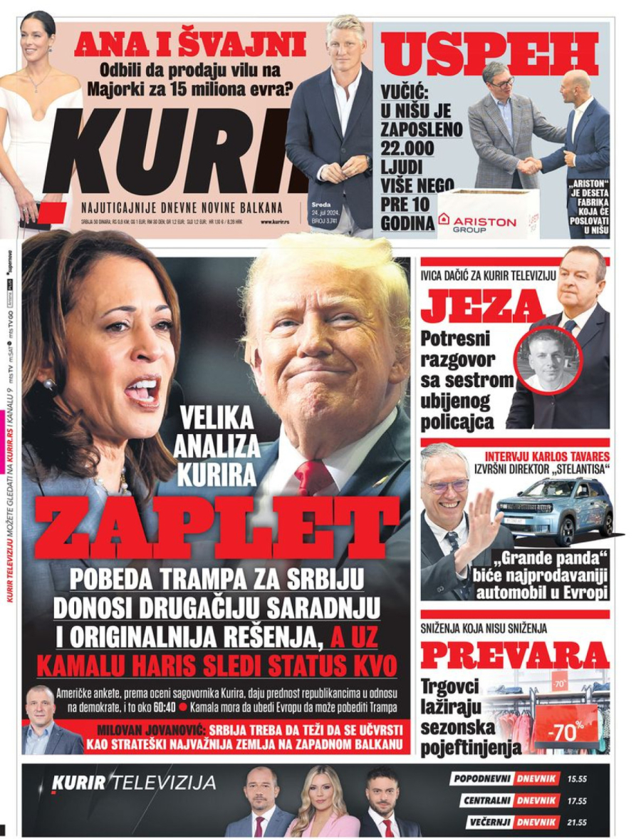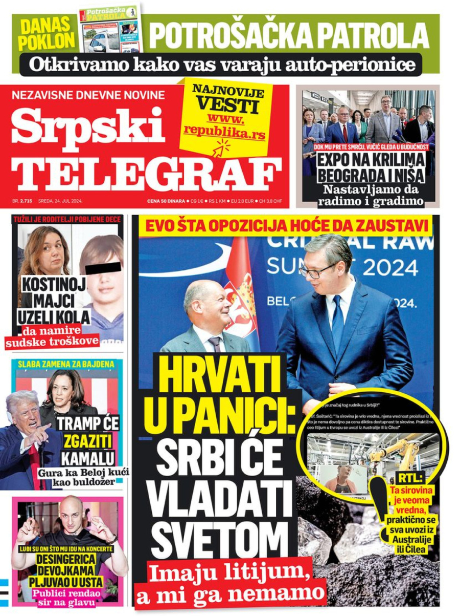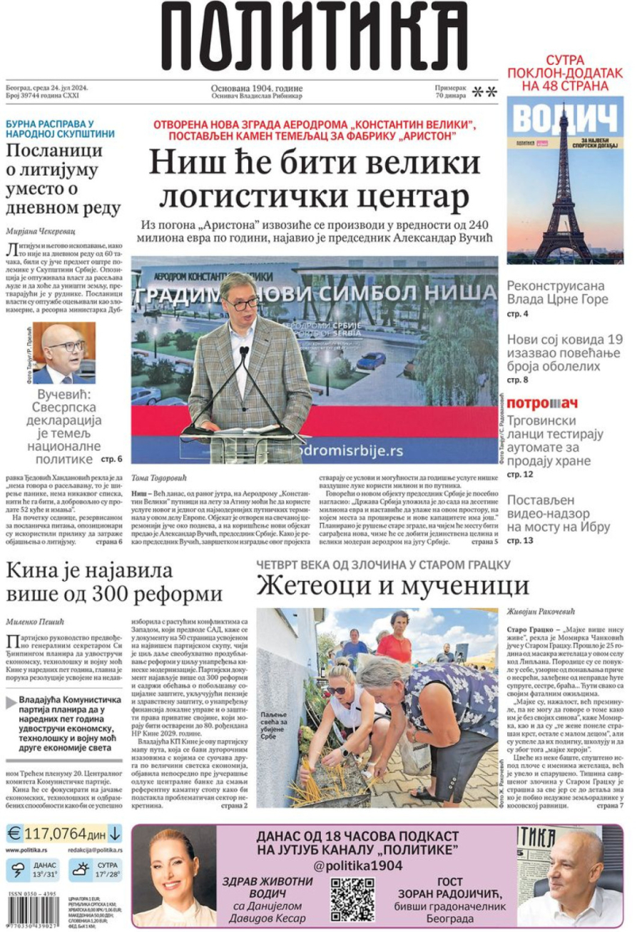Dnevne novine u Srbiji za sredu, 24. jul 2024. godine, na naslovnim stranama najavljuju brojne aktuelne društveno-političke teme.
