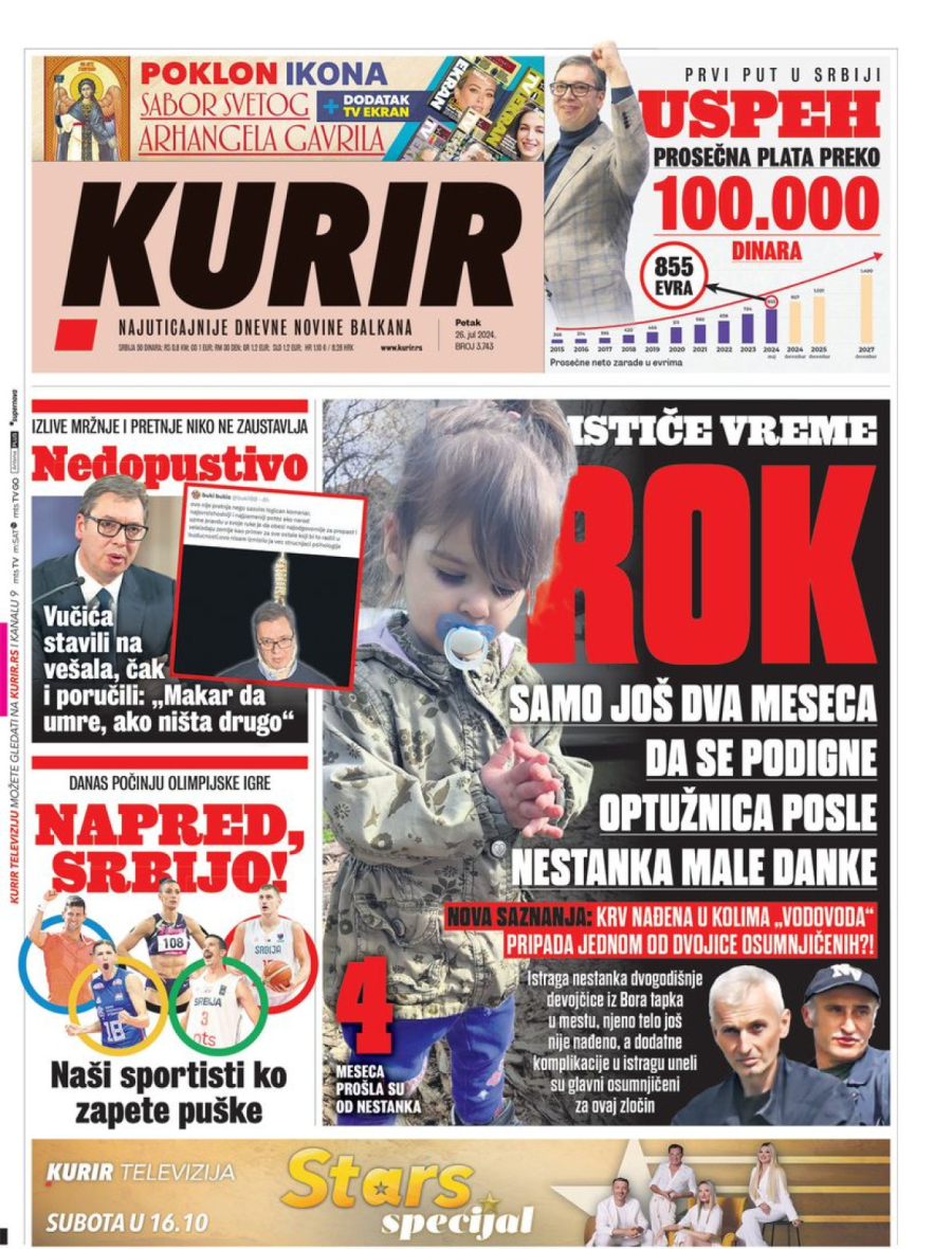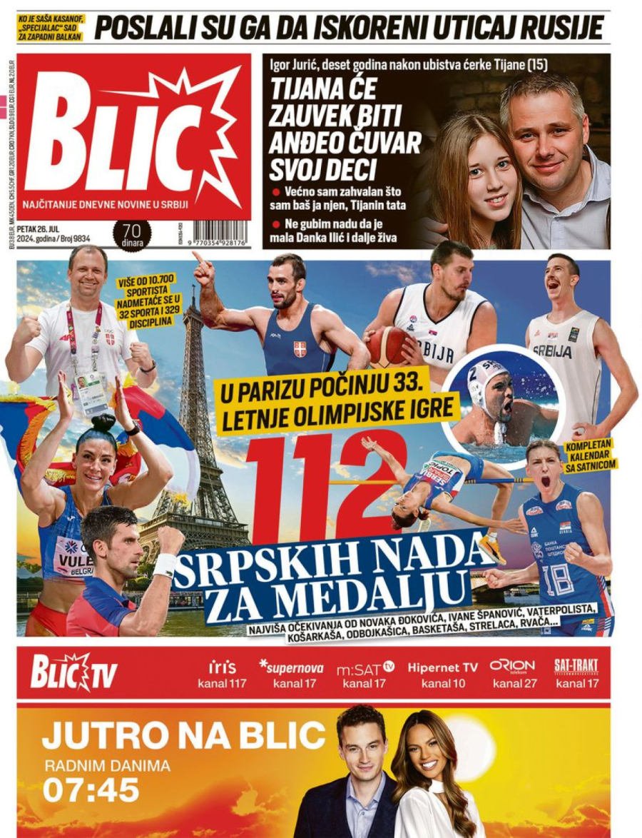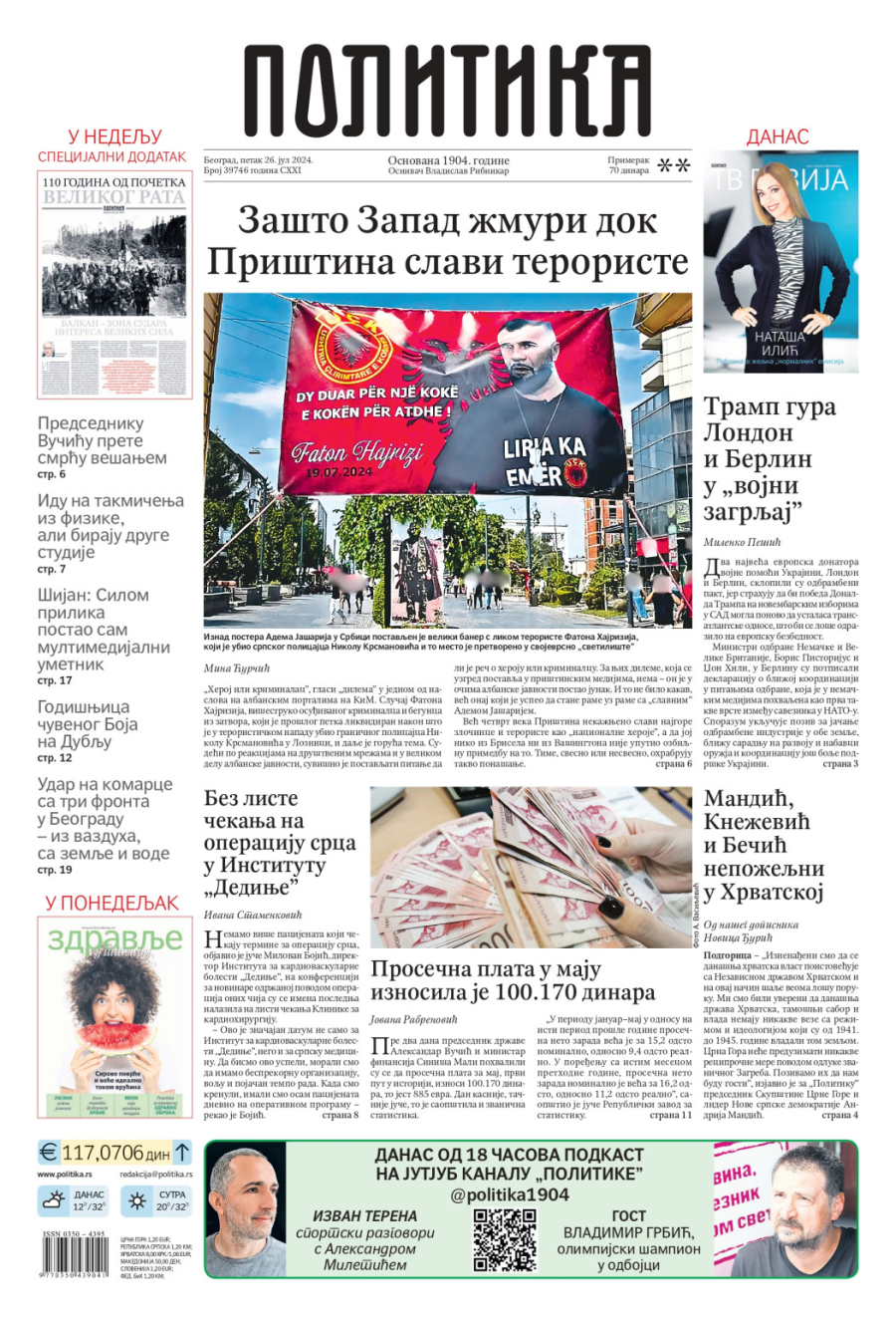 Dnevne novine u Srbiji za petak, 26. jul 2024. godine, na naslovnim stranama najavljuju brojne aktuelne društveno-političke teme i donose ekskluzivne priče.