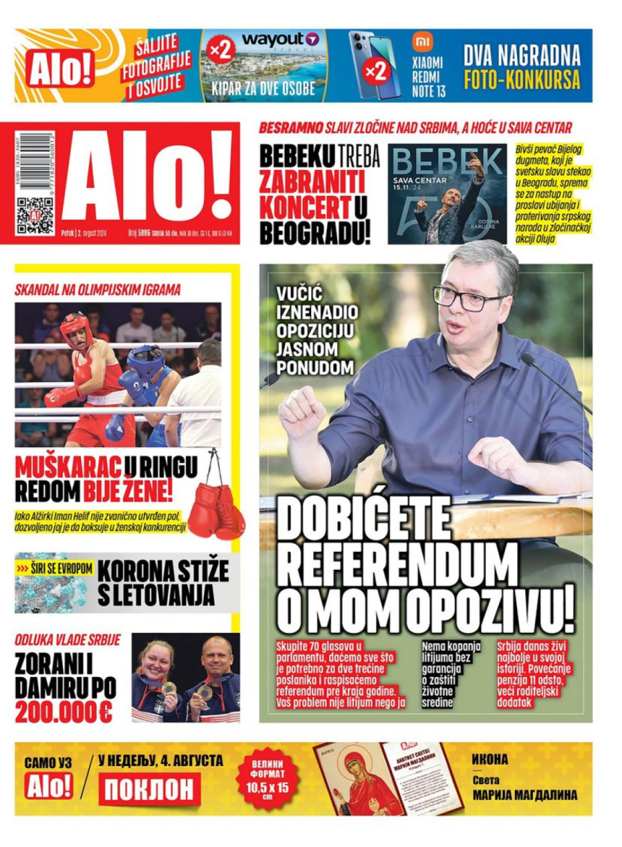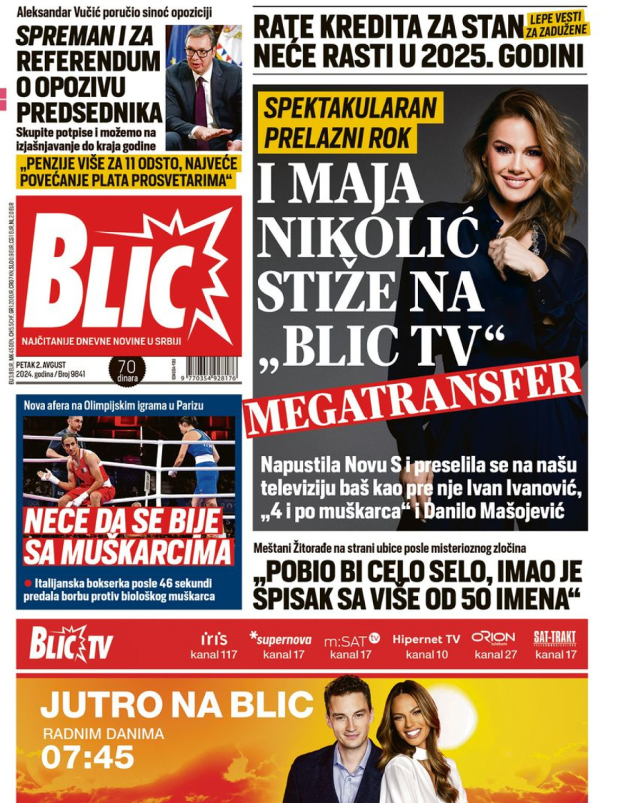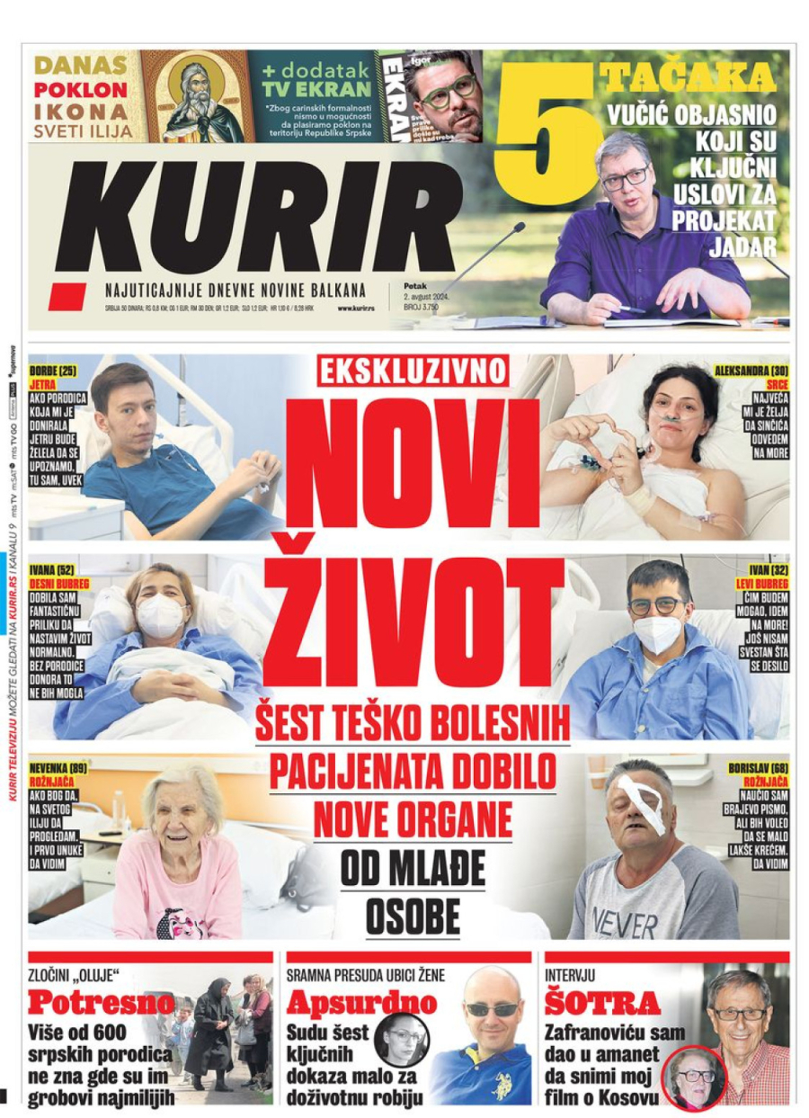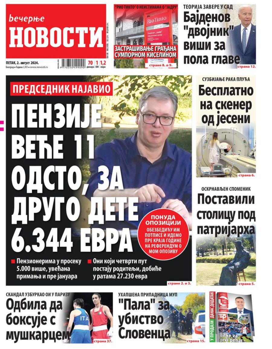 Dnevne novine u Srbiji za petak, 2. avgust 2024. godine, na naslovnim stranama najavljuju brojne aktuelne društveno-političke teme i donose ekskluzivne priče.
