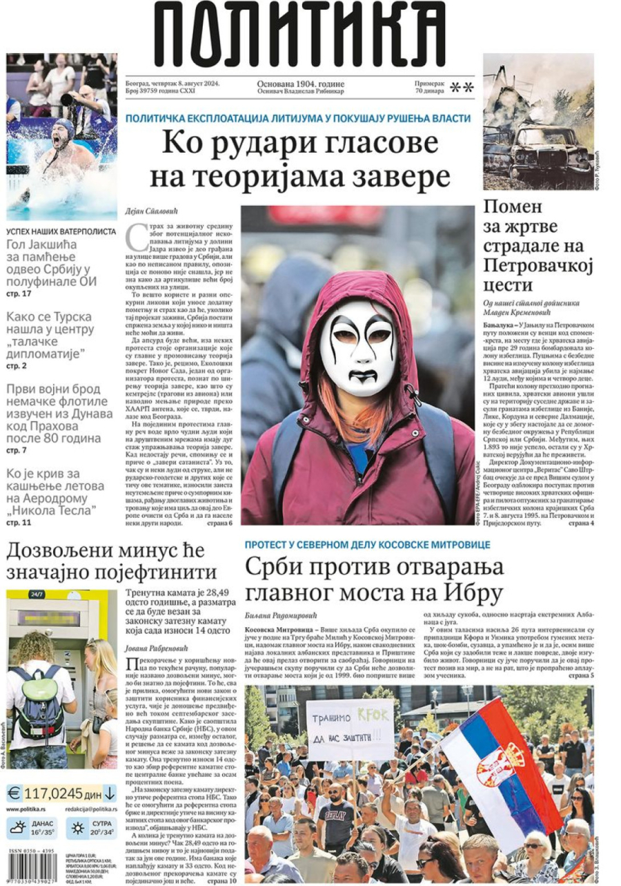 Novine: "Ko rudari glasove na teorijama zavere"; "Srbi i telima brane poslednji štit opstanka na severu KiM"
