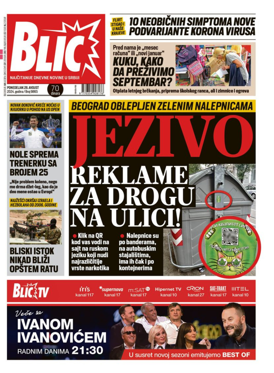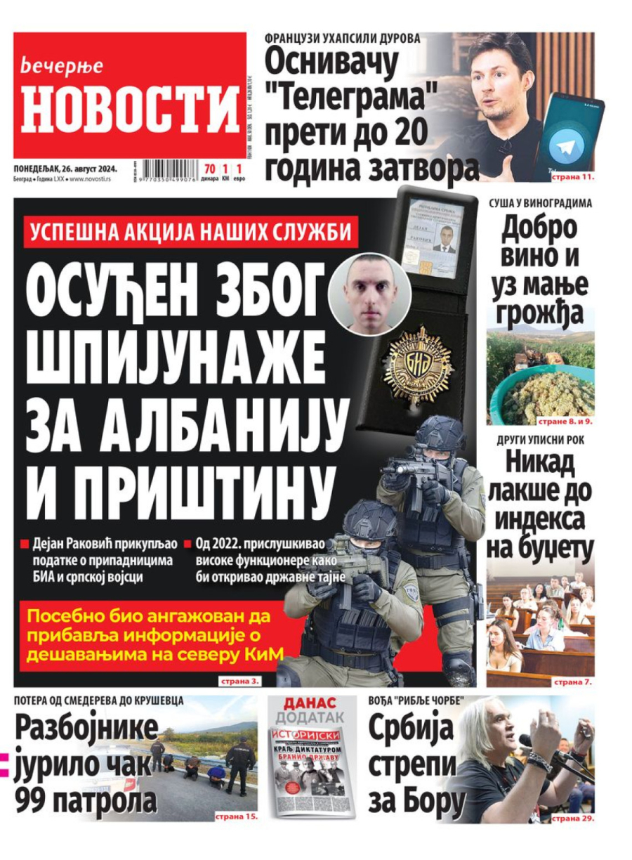 Novine: "Osuđen zbog špijunaže za Albaniju i Prištinu"; "Reklame za drogu na ulici"