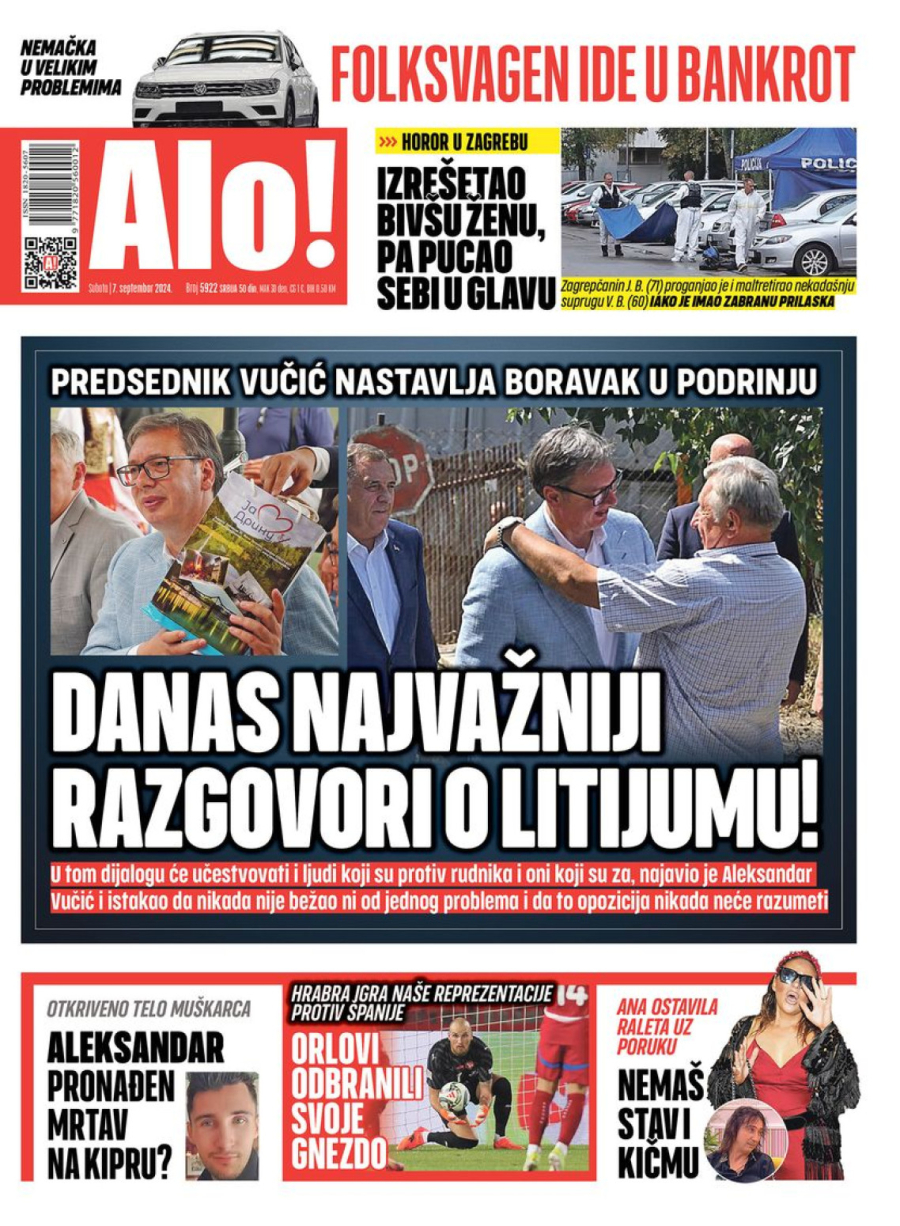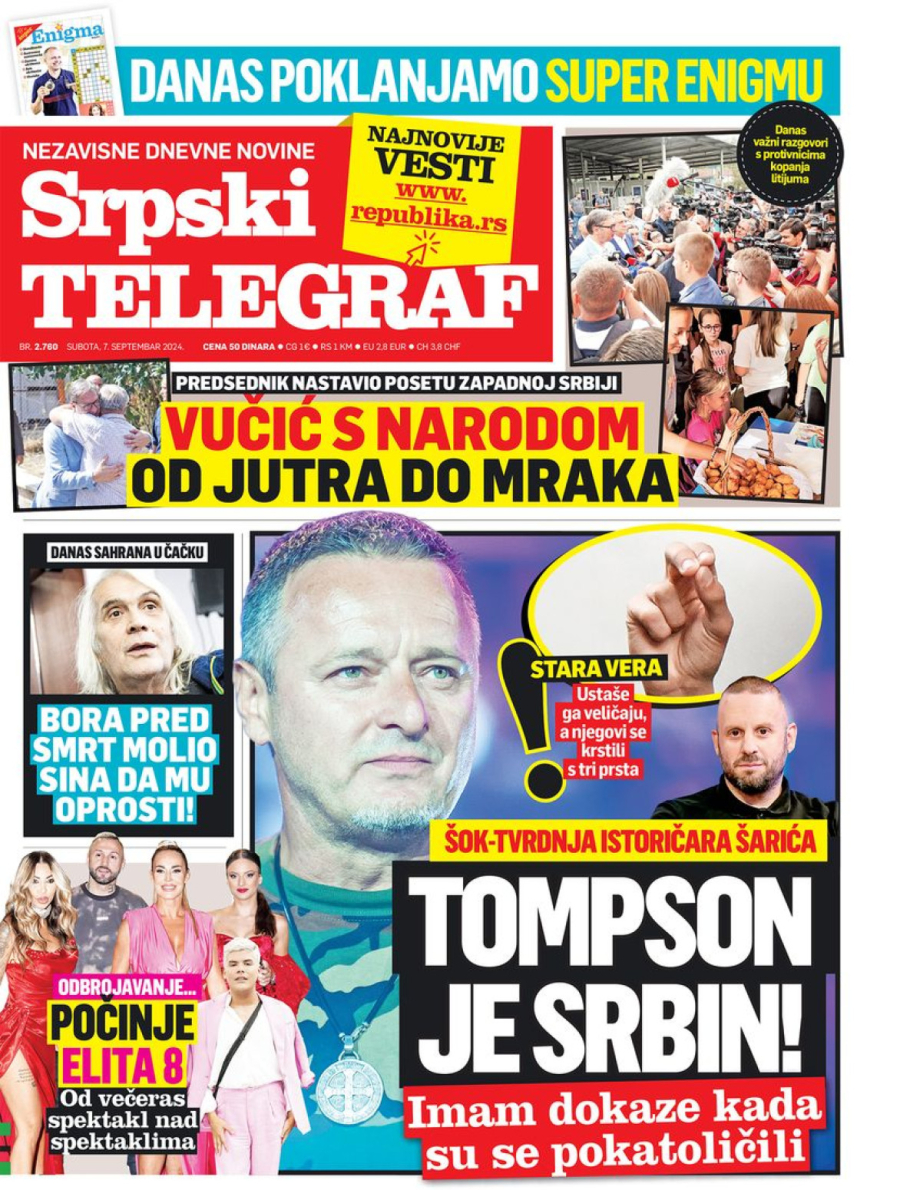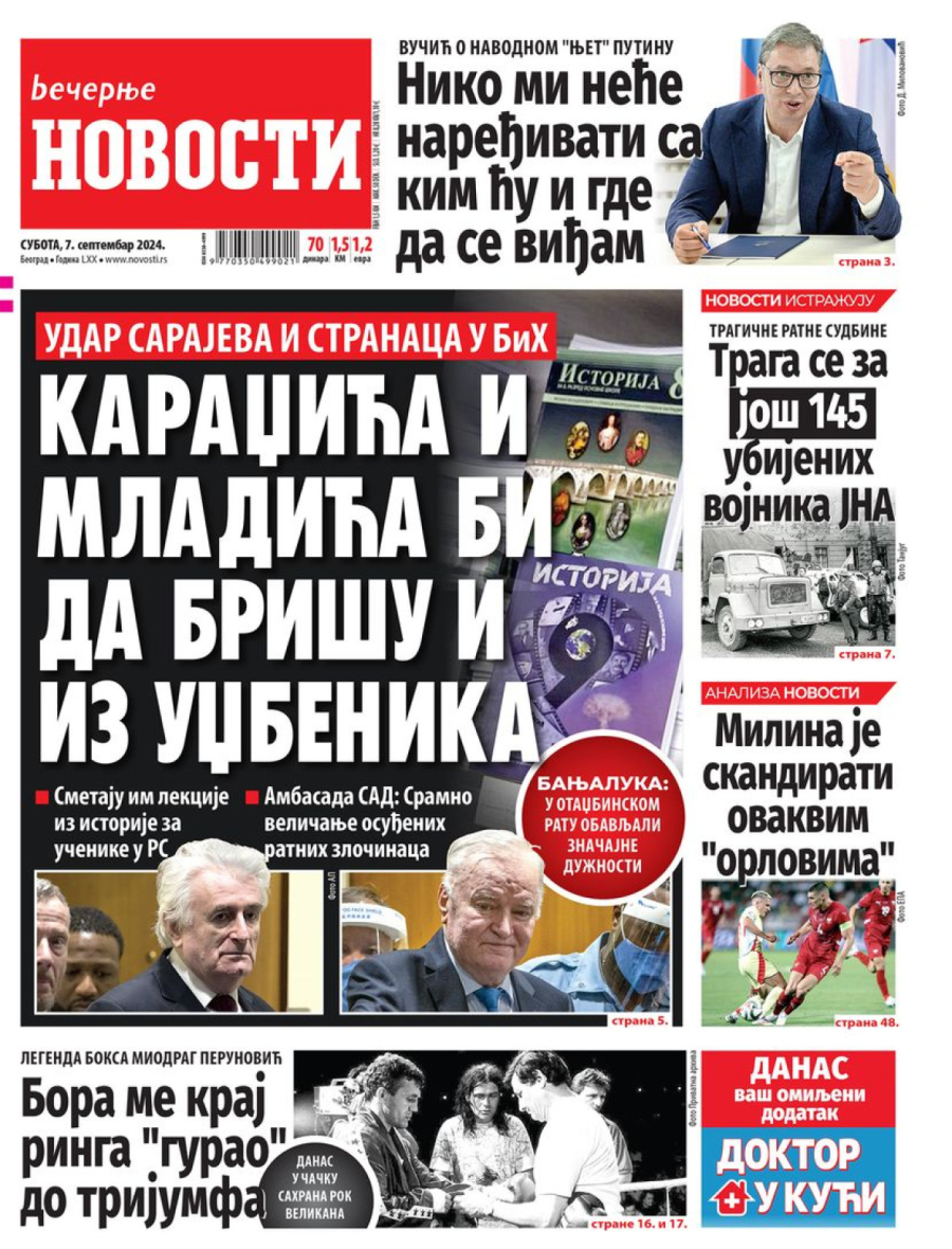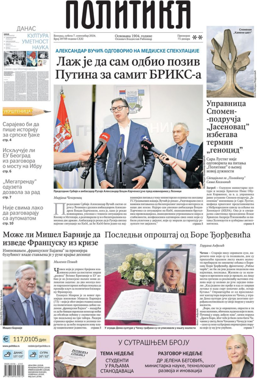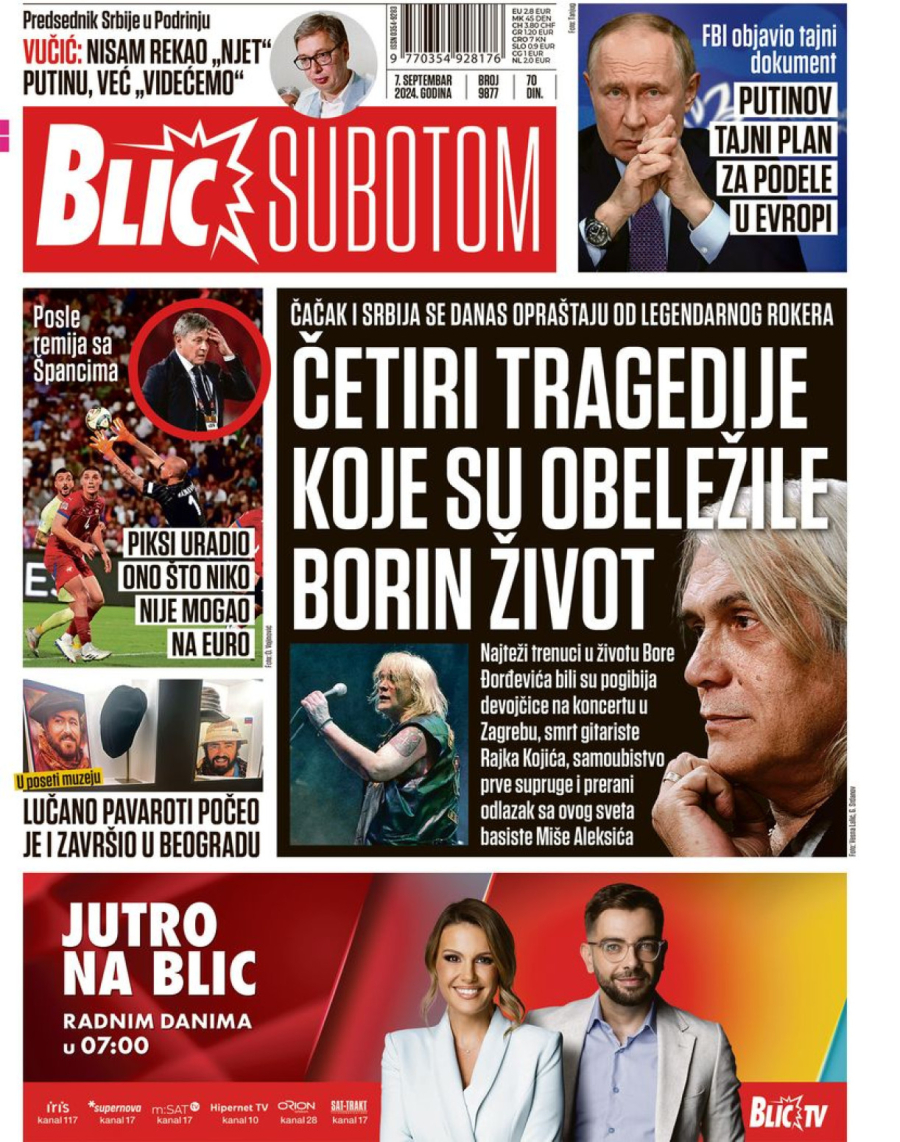 Dnevne novine u Srbiji za subotu, 7. septembar 2024. godine, na naslovnim stranama donose aktuelne društveno-političke teme i ekskluzivne priče. Jedna od centralnih tema je oproštaj od muzičke legende, Bore Đorđevića.