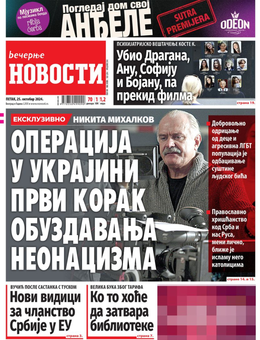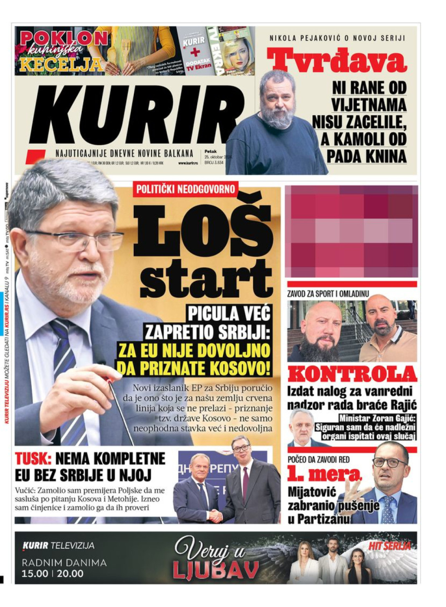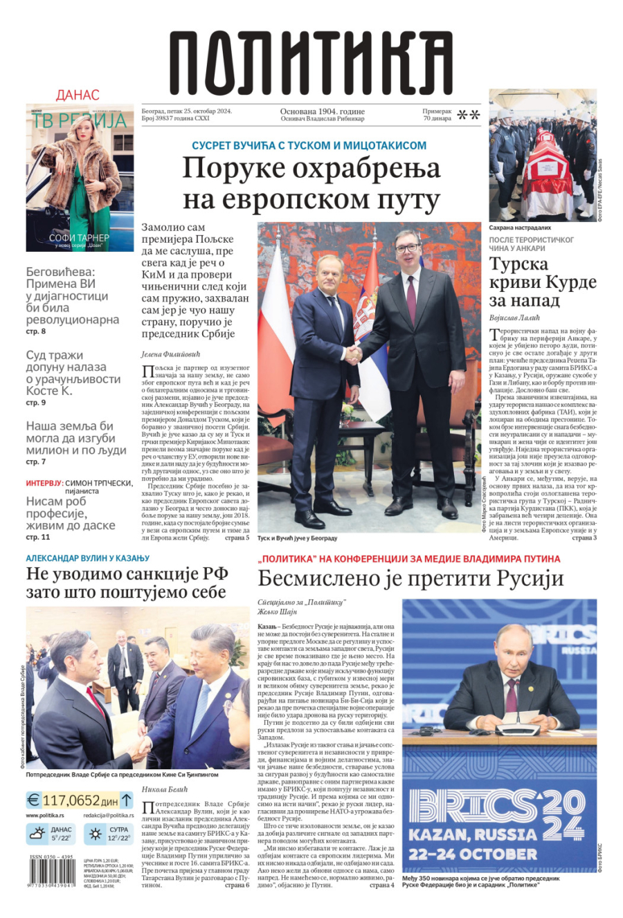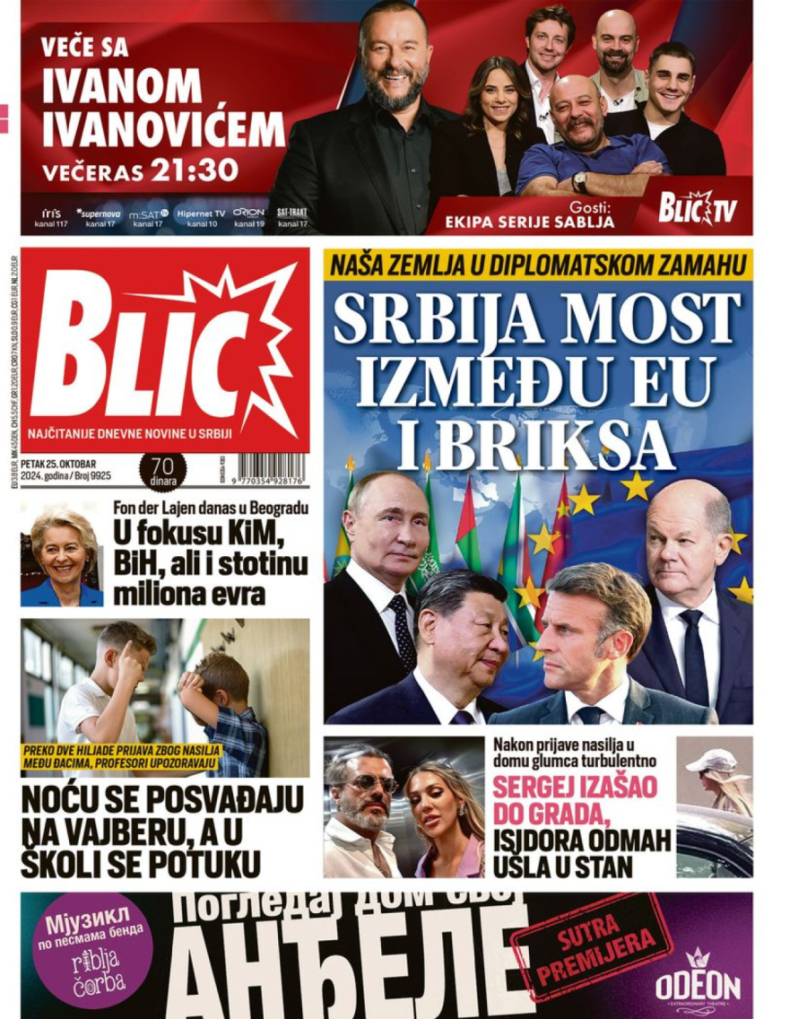 Dnevne novine u Srbiji za petak, 25. oktobar 2024. godine, na naslovnim stranama najavljuju brojne aktuelne društveno-političke teme i donose ekskluzivne priče.