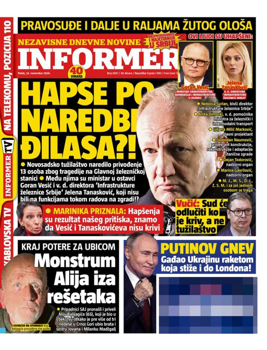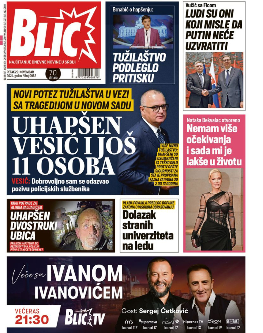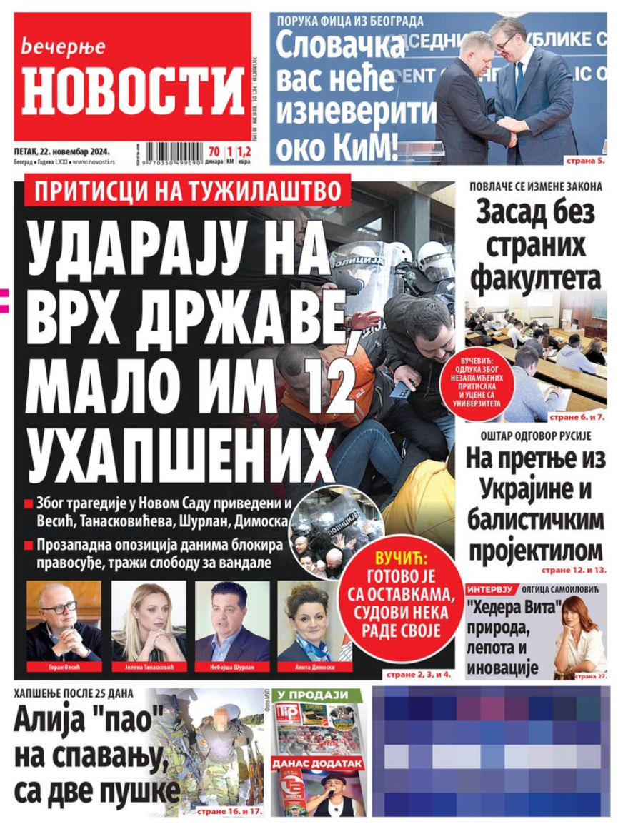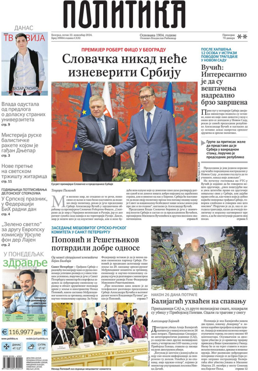 Dnevne novine u Srbiji za petak, 22. novembar 2024. godine, na naslovnim stranama najavljuju brojne aktuelne društveno-političke teme i donose ekskluzivne priče.
