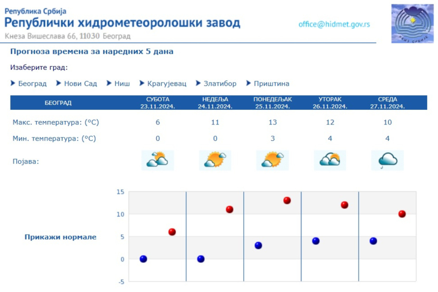 "Tokom noći prestanak padavina i delimično razvedravanje se očekuje prvo na severu i zapadu, a zatim i u većem delu zemlje, dok će u subotu ujutru slab sneg padati još samo na krajnjem jugu i jugoistoku. Na području Beograda u pojedinim delovima grada sa slabim snegom uz prestanak padavina u prvoj polovini noći", piše RHMZ.