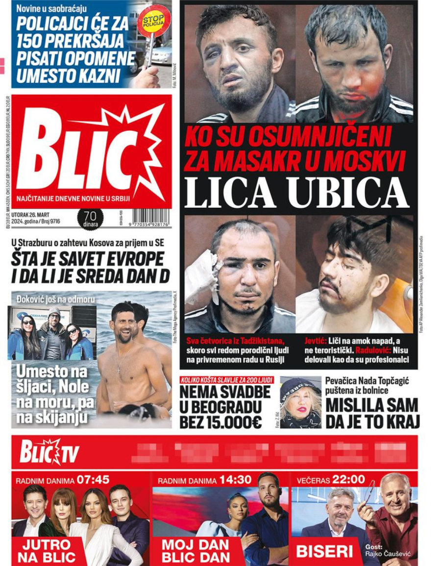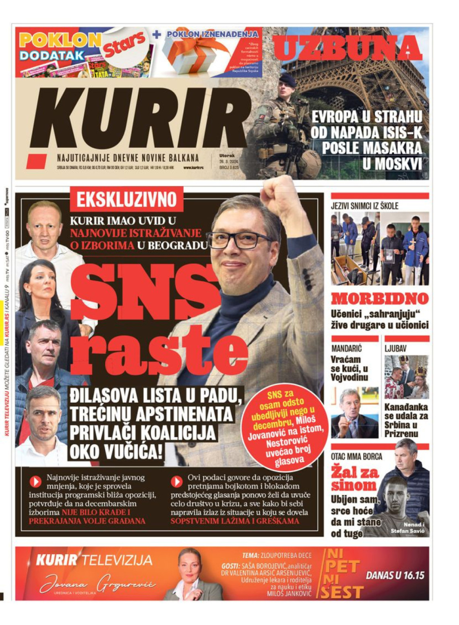 Dnevne novine u Srbiji za utorak, 26. mart 2024. godine, na naslovnim stranama donose brojne aktuelne društveno-političke teme i ekskluzivne priče.