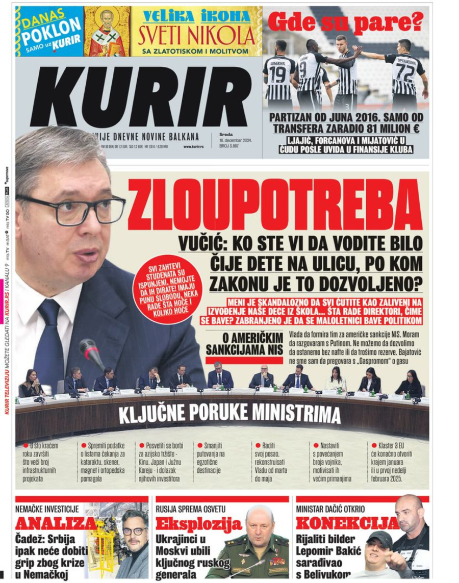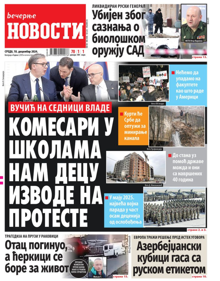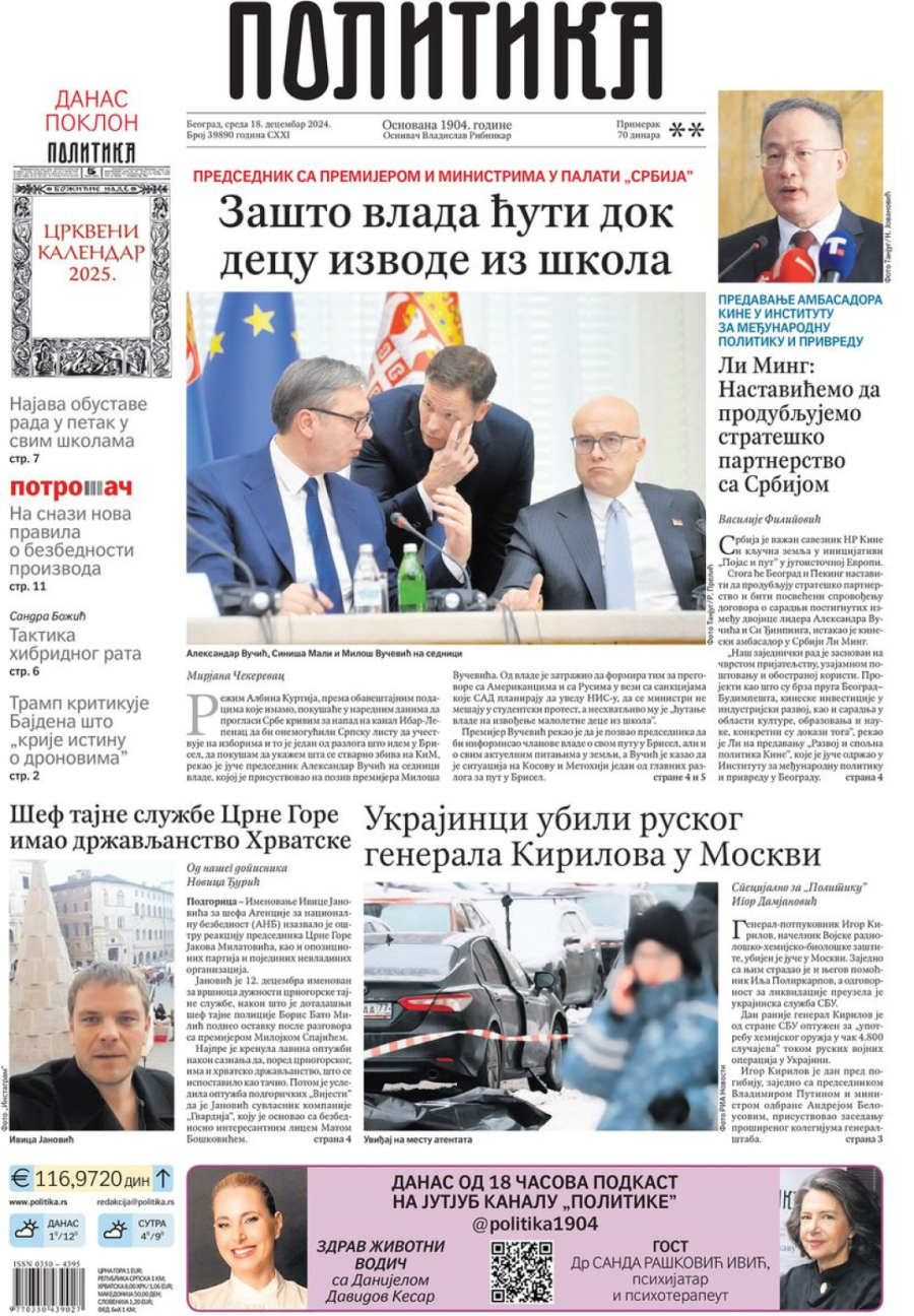Dnevne novine u Srbiji za sredu, 18. decembar 2024. godine, na naslovnim stranama donose brojne aktuelne društveno-političke teme i ekskluzivne priče.
