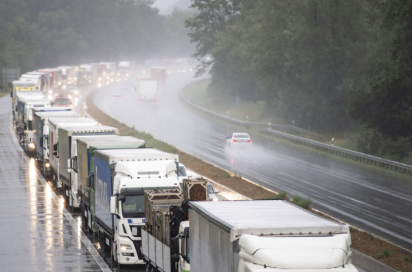 Teretna vozila čekaju po dva sada na izlazu iz zemlje na Gradini čekaju četiri sata, a na graničnom prelazu Sremska Rača sat vremena, saopštio je danas Auto-moto savez Srbije (AMSS).