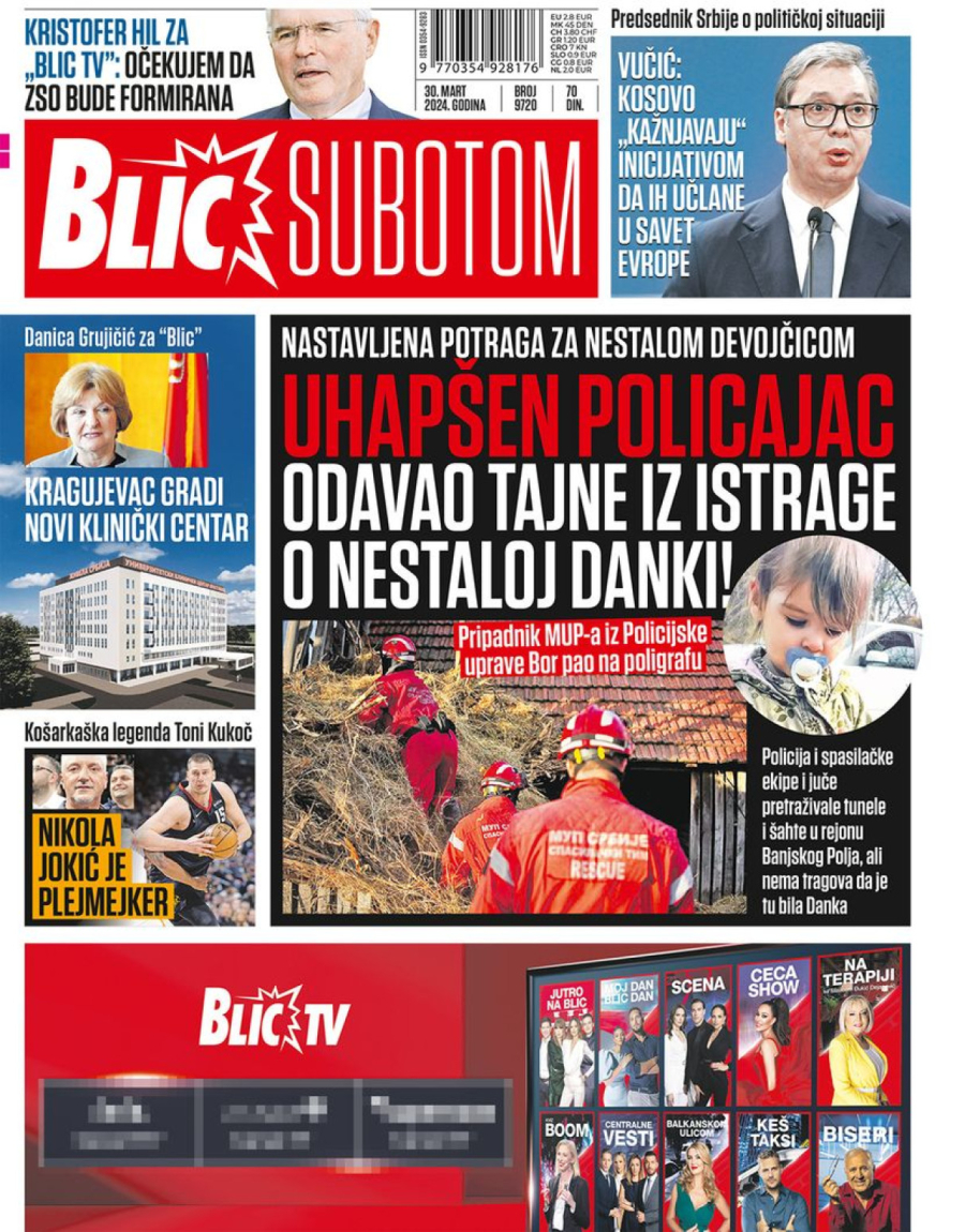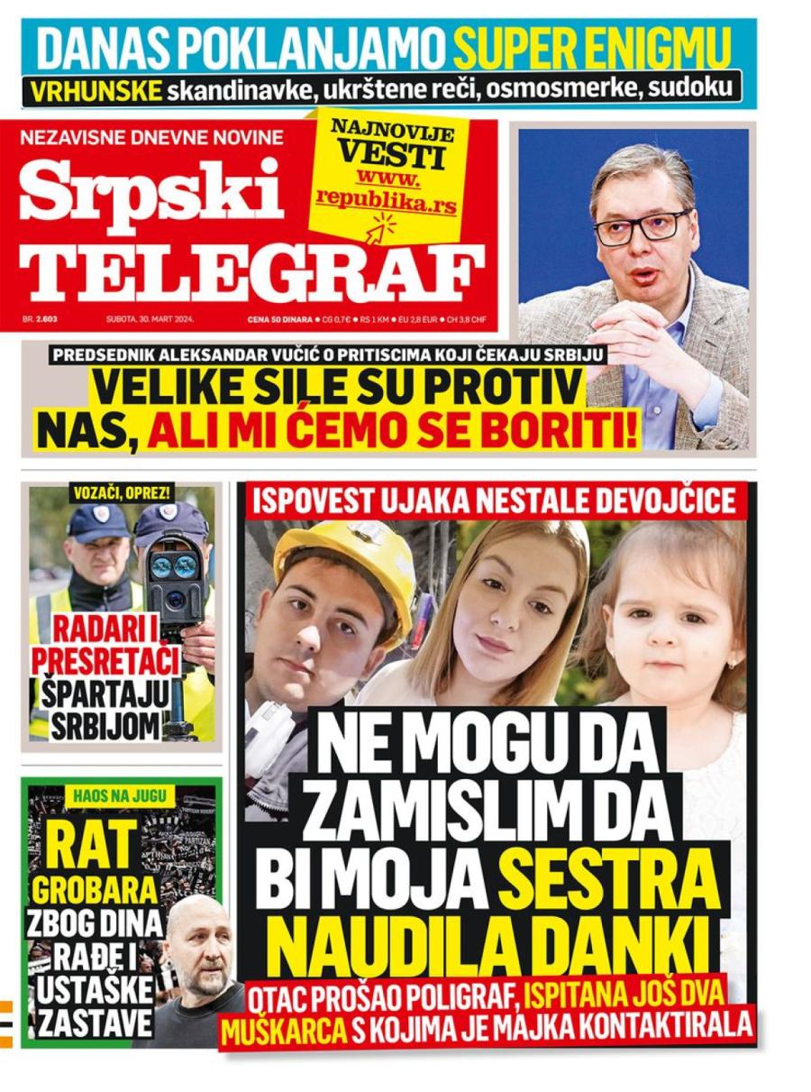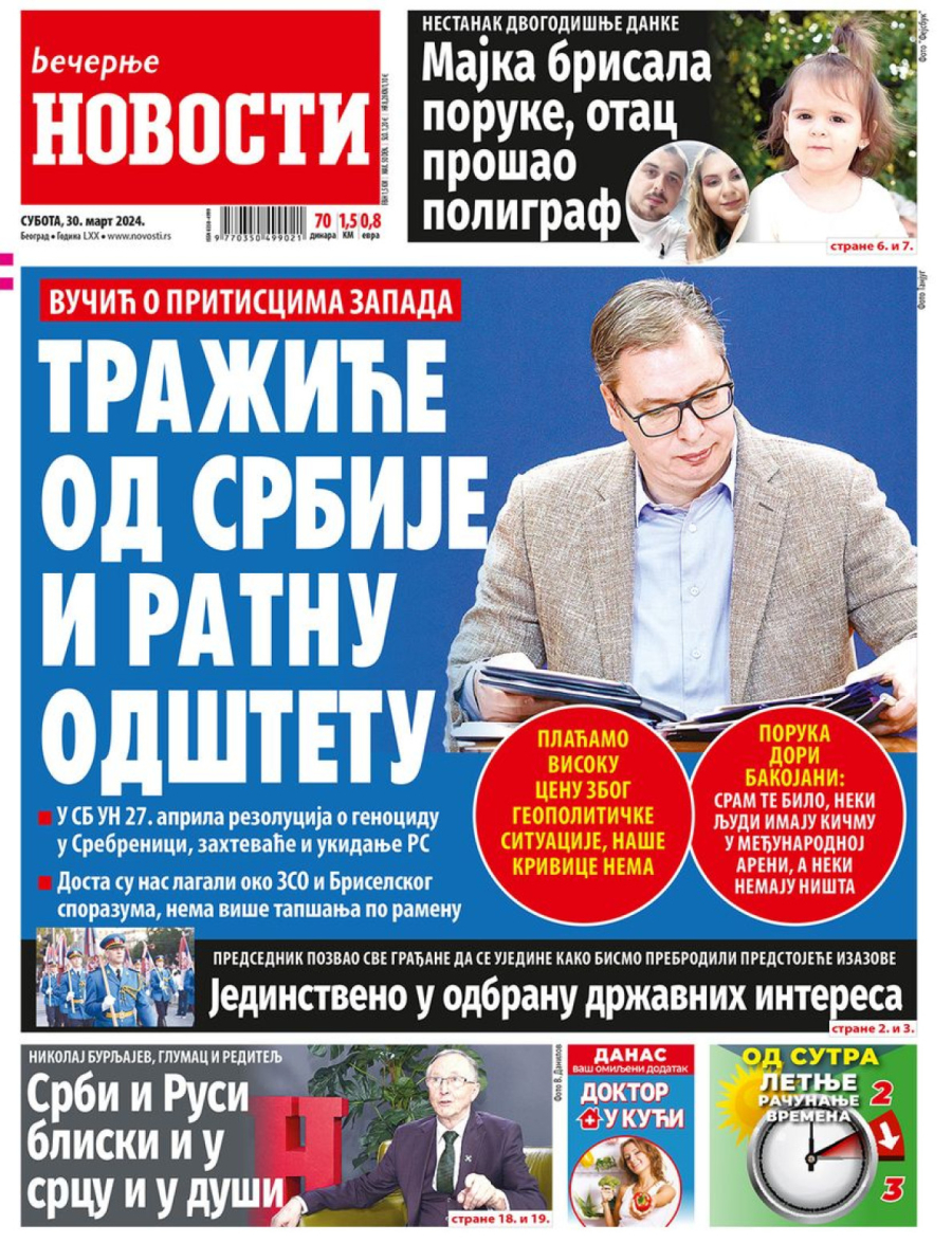 Dnevne novine u Srbiji za subotu, 29. mart 2024. godine, na naslovnim stranama najavljuju brojne aktuelne društveno-političke teme i donose ekskluzivne priče.