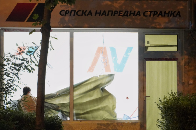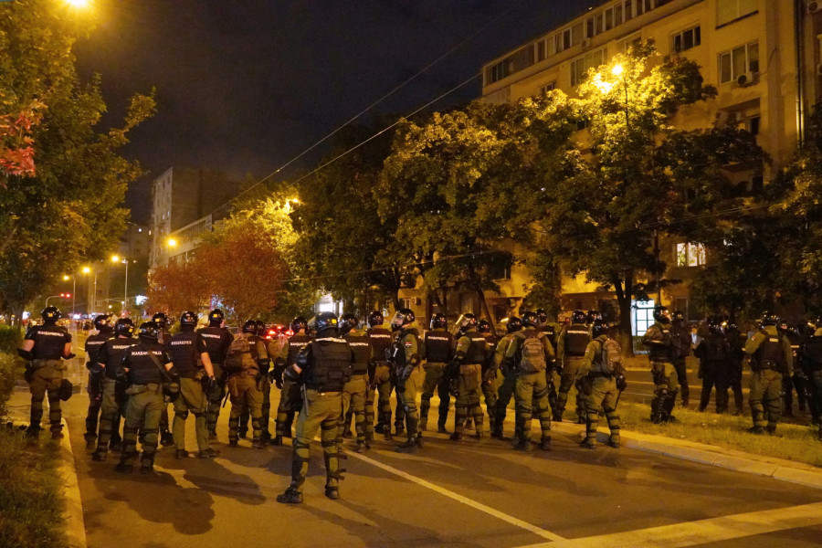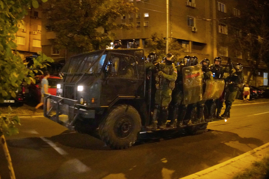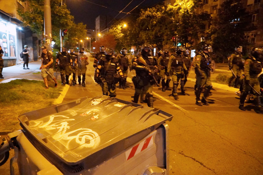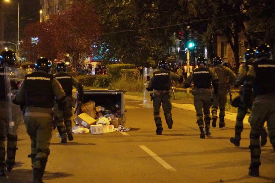 Oni u razbili stakla na prostorijama SNS i palili kontejnere, gadjali policiju kamenicama, a začuli su se i topovski udari, ali je posle napada na lice mesta stigla žandarmerija koja ih je potisnula ka Pravnom fakultetu.