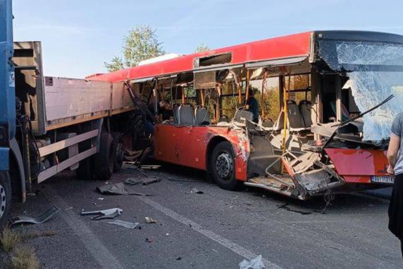 Autobus je jednim delom van puta, a od siline udarca zakucao se u zid.