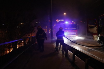 Na terenu su vatrogasne ekipe koje rade na gašenju vatre i obezbeđivanju sigurnosti u okolini mosta.