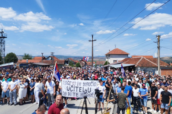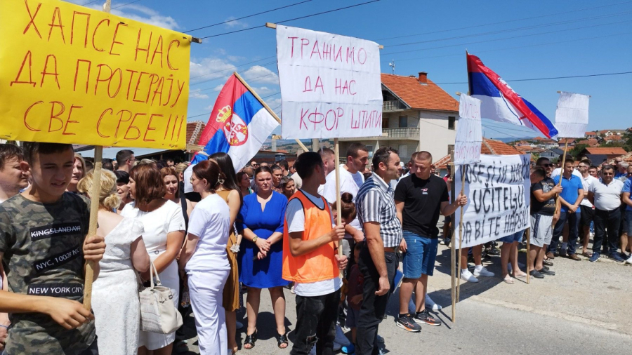 Protest je počeo tačno u 12 časova na centralnom Trgu, a okupljeni nose transparente "Tražimo da nas KFOR zaštiti", "Uhapšeni a nisu krivi", "Hapse nas da proteraju sve Srbe!", "EVROPO, zašto ćutiš na stradanje Srba?", "Svaki dan trpimo teror, a svet ĆUTI", "Loše si ih naučio učitelju, da bi te hapsili!".