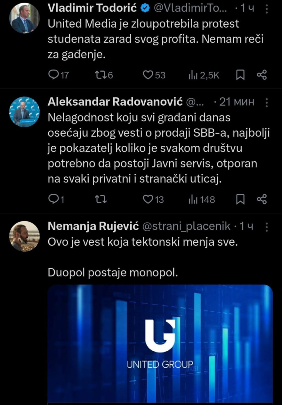 Vladimir Todorić reagovao je jutros na vest da je Junajted medija prodala SBB i poručio da je zloupotrebila protest studenata.