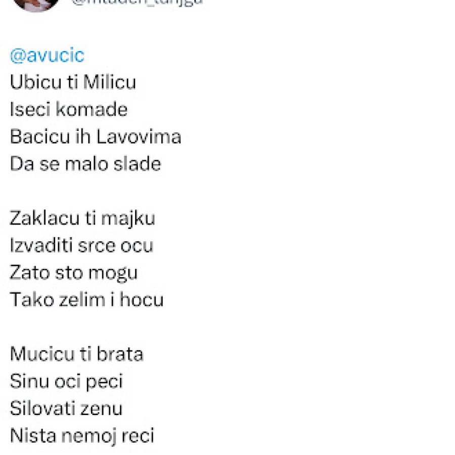 Tanjga je u svojoj bolesnoj objavi pretio da će ubiti Milicu te da će je potom iseći na komade.