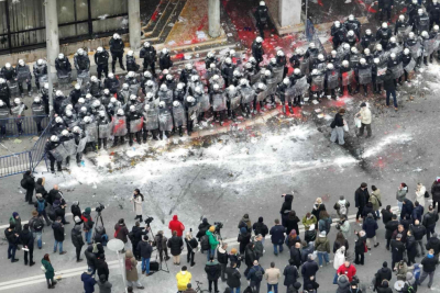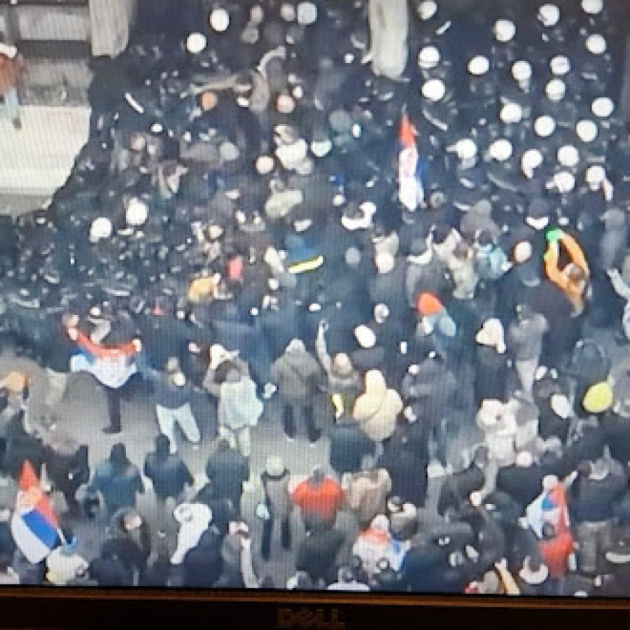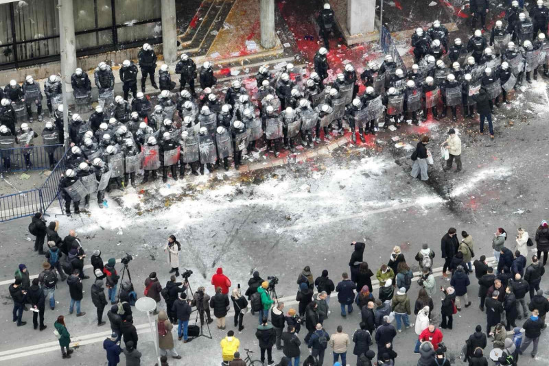 Učesnici protesta ispred Skupštine grada u Novom Sadu gađaju jajima zgradu Skupštine grada i pripadnike policije.