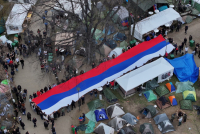 Studenti koji hoće da uče razvili su zastavu naše zemlje dugačku gotovo 30 metara danas u Pioirskom parku, gde su noćas proveli osmu noć, čekajući da se ispune njihovi zahtevi.