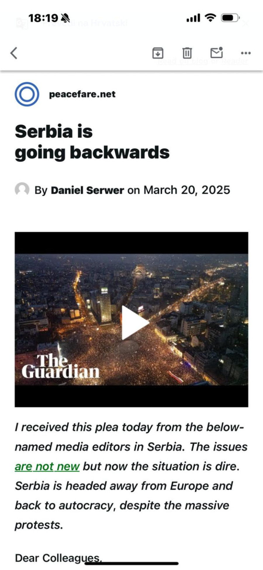 Na sajtu peacefare.net objavljen je tekst u kojem se prenosi žalba pojedinih novinara na situaciju u Srbiji.