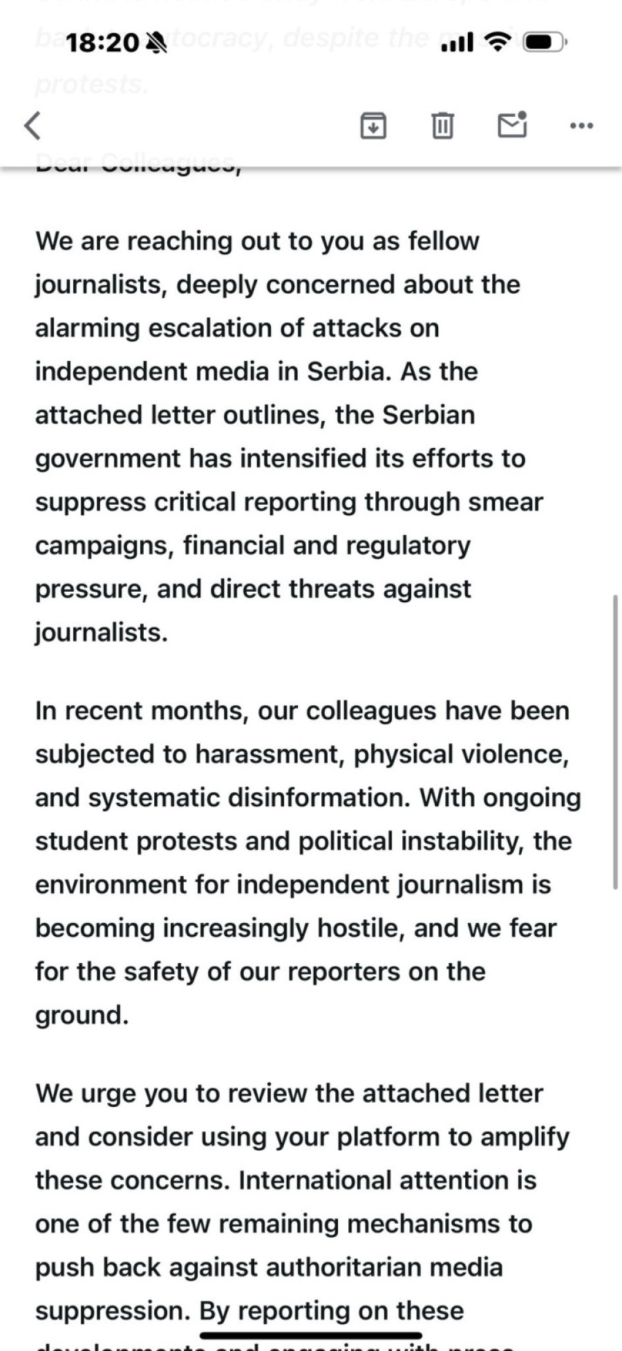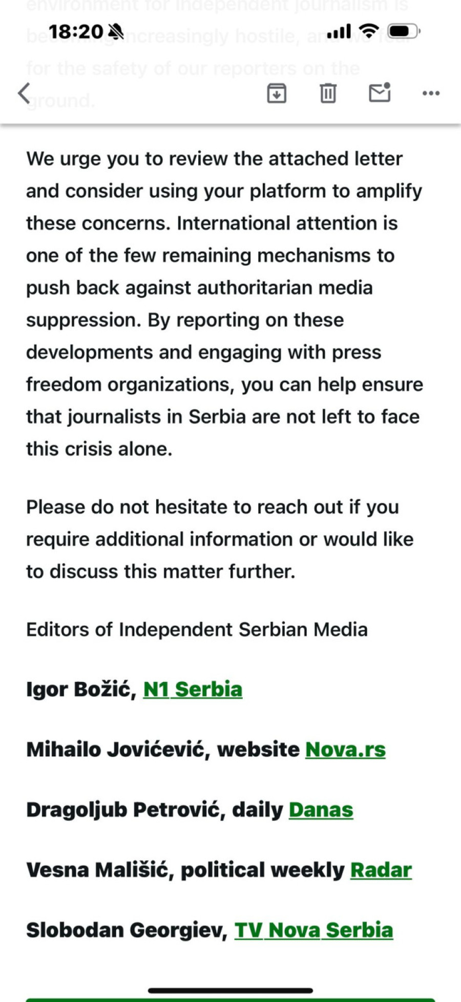Naime, novinari opozicionih medija iz Srbije traže podršku kolega iz inostranstva i navode da su na raspolaganju da za strane medije pričaju o tome.