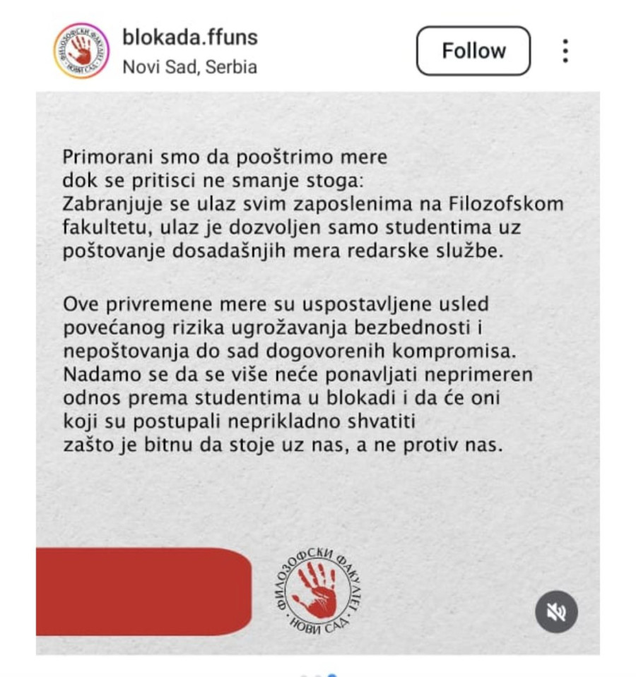 Blokaderi sa Filozofskog fakulteta Univerziteta u Novom Sadu saopštili su danas da su usled "nemilih događaja i narativa određenih profesora i profesorki" primorani da pooštre mere blokade, prenose mediji.